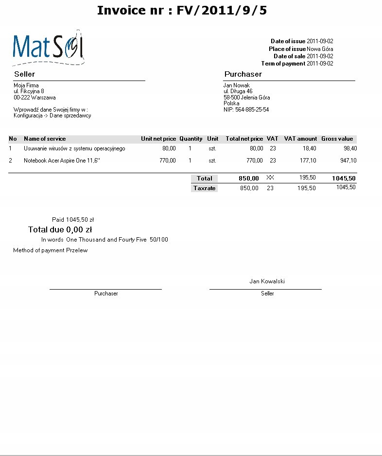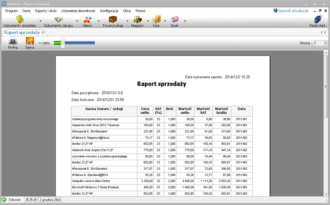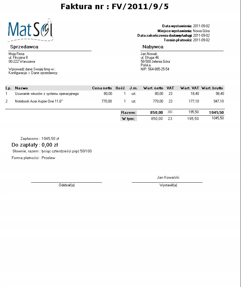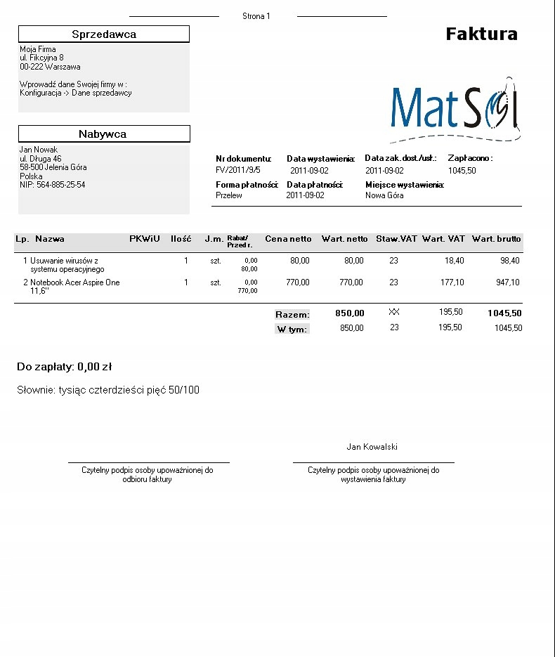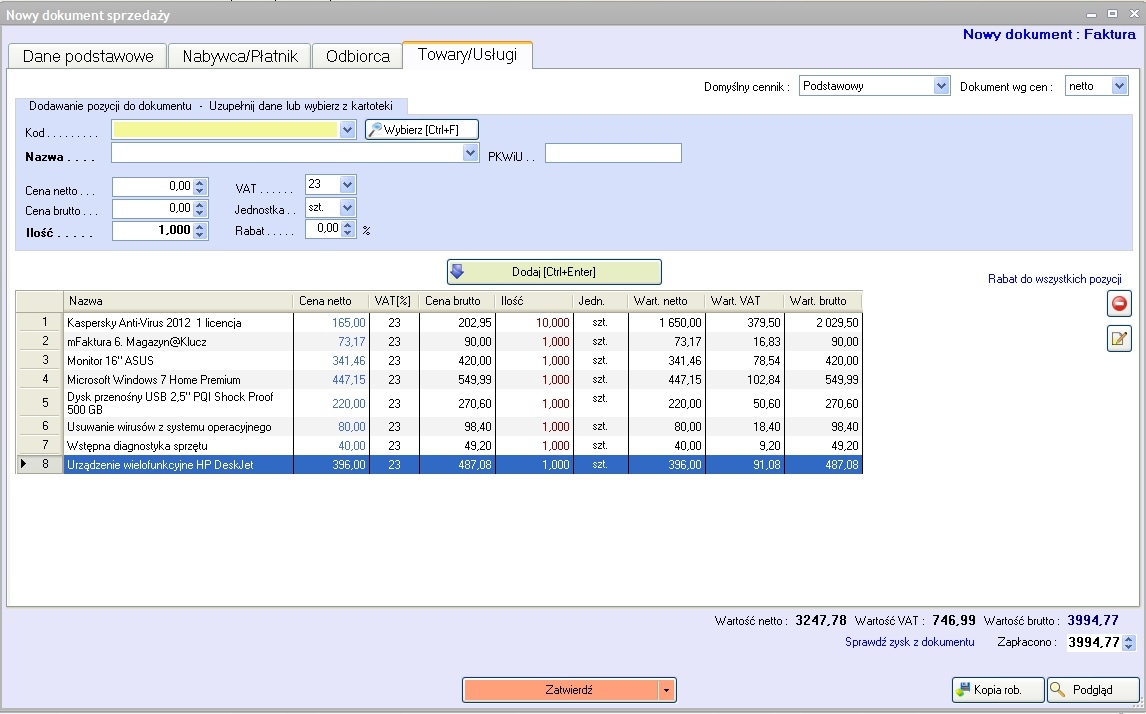 Tym programem wystawisz następujące dokumenty sprzedaży : Faktura, Faktura Korekta, Faktura pro-forma, Faktura Zaliczkowa, Faktura końcowa, Faktura do paragonu, Faktura eksportowa, Faktura WDT, Faktura Marża, Faktura RR, Paragon, Paragon korygujący, Rachunek, Oferta, Zamówienie, Karta gwarancyjna