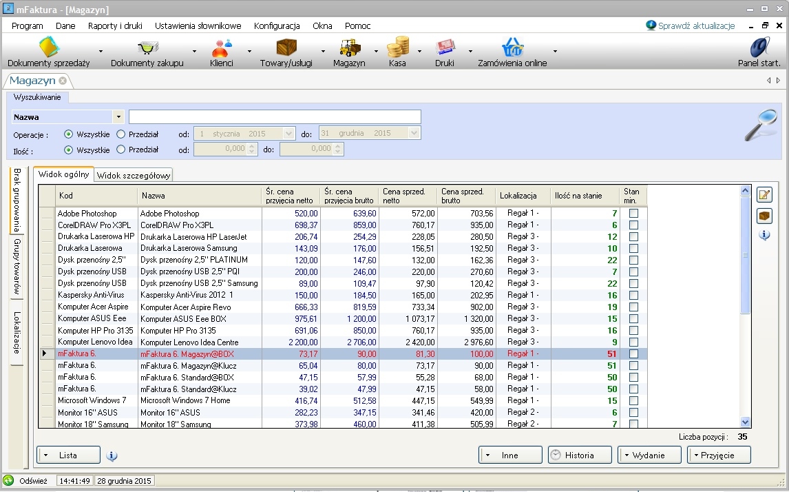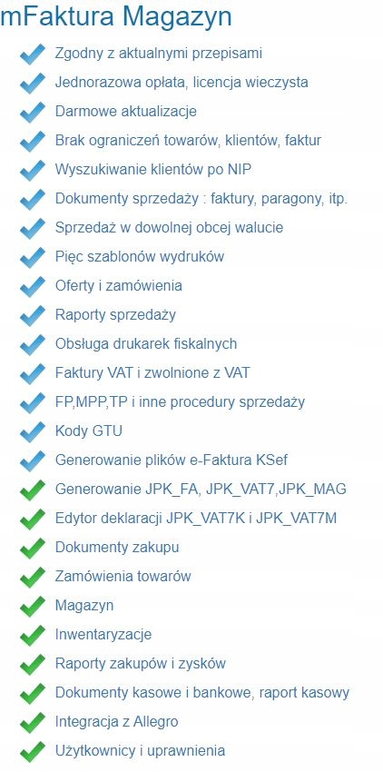 Ta wersja programu wyposażona została w moduł obsługi magazynu. Funkcja magazynu to nie tylko informacje o stanach ilościowych, ale również min. : prowadzenie ewidencji zakupów i przyjęć magazynowych, śledzenie historii przeprowadzanych operacji przyjęć, wydań i sprzedaży towarów/usług, przeprowadzanie inwentaryzacji, tworzenie szczegółowych raportów zysków ze sprzedaży. Ponadto prezentowana wersja mFaktura Magazyn, w stosunku do wersji Standard posiada inne funkcje już niezwiązane ściśle z gospodarką magazynową, min : moduł użytkowników i przypisywania im uprawnień, dokumenty kasowe, bankowe, raport kasowy Interesującą funkcją jest moduł integracji z Allegro. Jest to bardzo wygodne rozwiązanie, pozwalające w automatyczny sposób importować zamówienia z konta Allegro. Pobrane zamówienia właściwie jednym kliknięciem można zamienić w dokument sprzedaży, tj. fakturę lub paragon. Funkcjonalność ta znacznie zaoszczędzi czas osobom handlującym na Allegro Więcej na temat różnic w opisie poniżej.