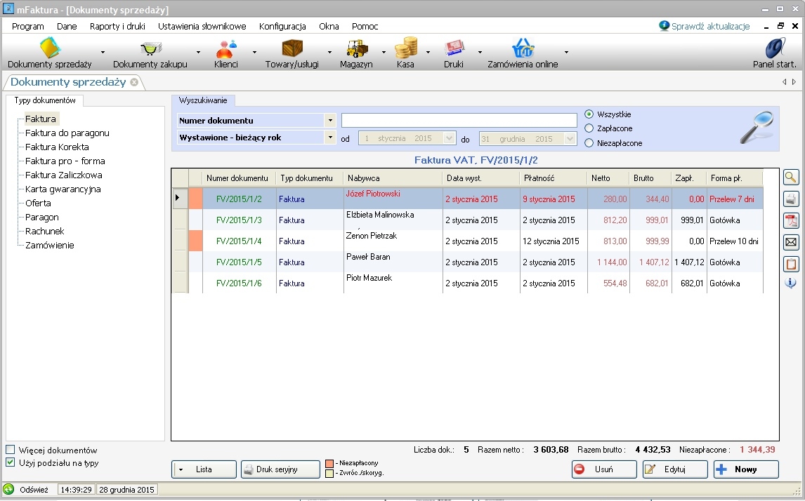 Zakupowe : Faktura zakupu, Faktura zakupu korekta, Faktura zakupu zaliczkowa