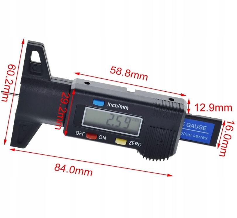 Датчик глубины протектора имеет очень широкий диапазон измерения: 0-25,4 мм, поэтому подходит для шин легковых и грузовых автомобилей. Точность измерительный прибор составляет до 0,01 мм, поэтому мы уверены, что устройство очень точное. Результат измерение может быть дано в зависимости от предпочтений пользователя-в миллиметрах или кэлах. четкий дисплей.