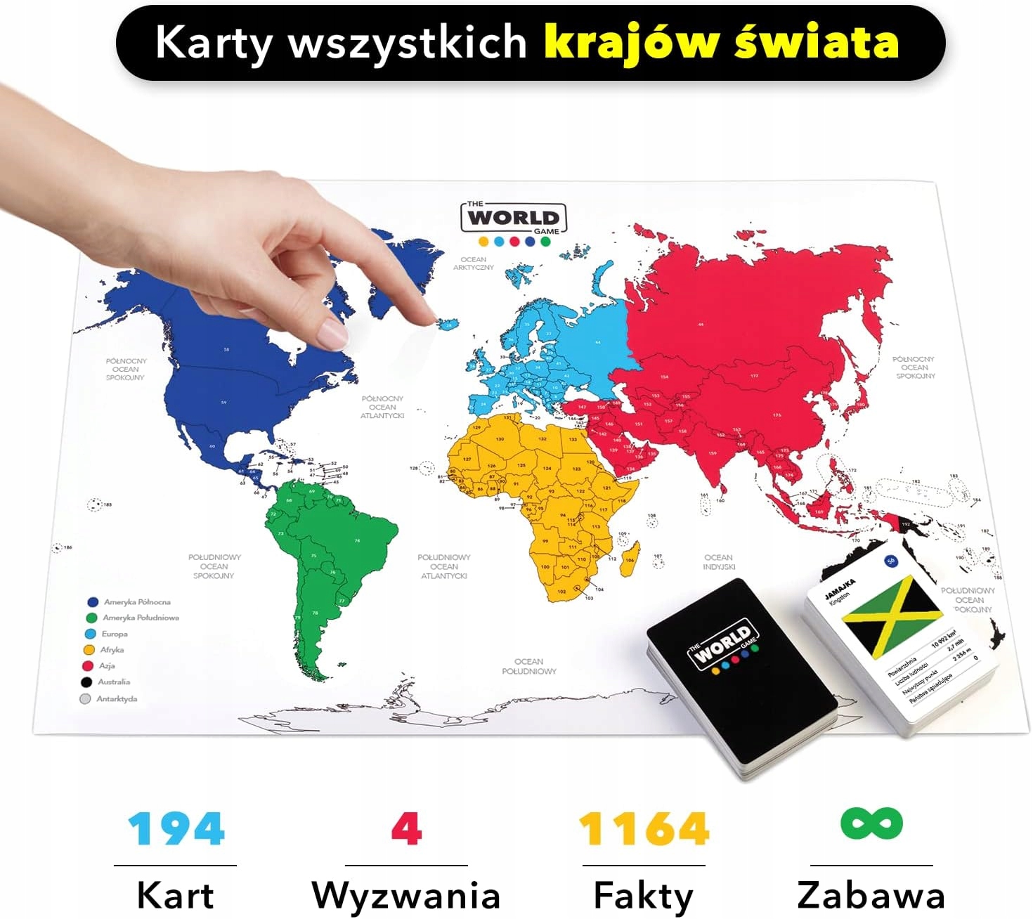 ✅ Światowe Odkrywanie - Gra Karciana z Geografią" to zestaw zawierający wszystkie 194 kraje oraz mapę świata.