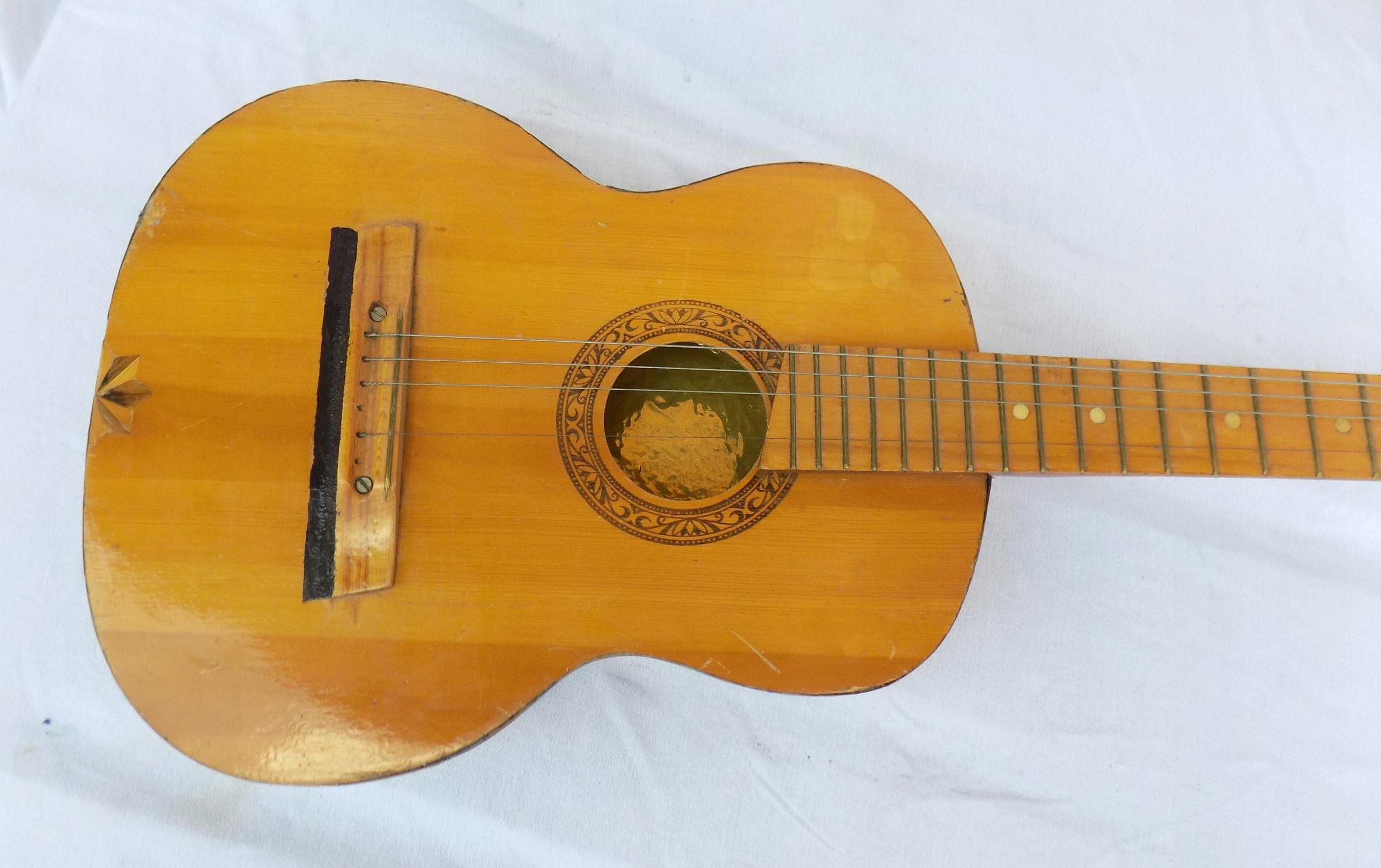 Gitara akustyczna z okresu PRL. Przedmiot do renowacji, brak dwóch strun. Stan jak na zdjęciach. Wymiary 100 x 37 x 10 cm.