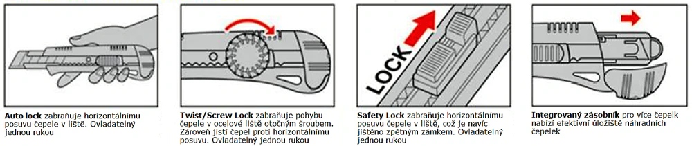 Nowy bezpieczny nóż w grupie standard wyposażony jest w suwak ostrza blokujący wysuw ostrza w trakcie cięcia i umożliwiający wycofanie się ostrza w przypadku nacisku w kierunku przeciwnym.