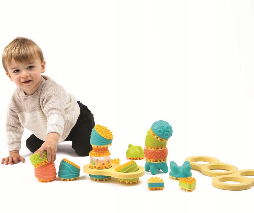 Moduły o niejednorodnej strukturze, wykonane z materiałów o zróżnicowanej twardości i osobliwe, intrygujące kształty pobudzą ciekawość dziecka.