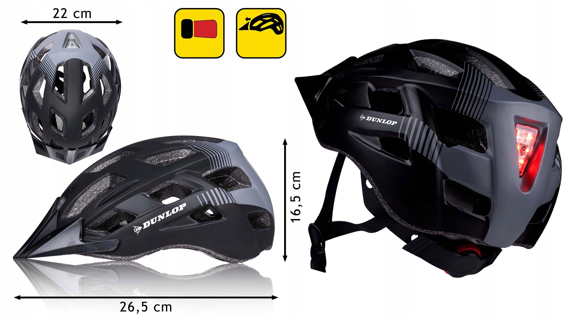 ➡️ Lampka LED umieszczona z tyłu kasku z 6 diodami i 3 trybami pracy.