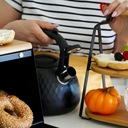 Czarny czajnik nierdzewny Konighoffer Mauro 3 l ma wykończenie w postaci elementów soft touch, które się nie nagrzewają i są antypoślizgowe. Rozwiązania konstrukcyjne chronią użytkownika przed przypadkowym oparzeniem dłoni. Uchwyt soft touch ma tu mechanizm bezdotykowego uchylania i opuszczania gwizdka. Konstrukcja zapewnia energooszczędność przygotowania wrzątku oraz chroni czajnik przed przegrzaniem. Czyszczenie i odkamienianie nie wymagają wiele wysiłku. Równie sprawnie zagotujesz w nim wodę na kuchence gazowej, jak na indukcji. Pojemność całkowita modelu Mauro to 3 litry. Gwizdek zawsze na czas przypomni ci o gotującej się wodzie. Walory ozdobne produktu uzyskano dzięki matowemu wykończeniu. To dobry pomysł na prezent i duża pomoc w robieniu wody na kawę lub herbatę. Mocowany na stałe gwizdek nie spadnie nigdy na kuchenkę i nie stopi się. Docenią to zwłaszcza osoby starsze.
