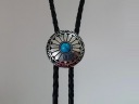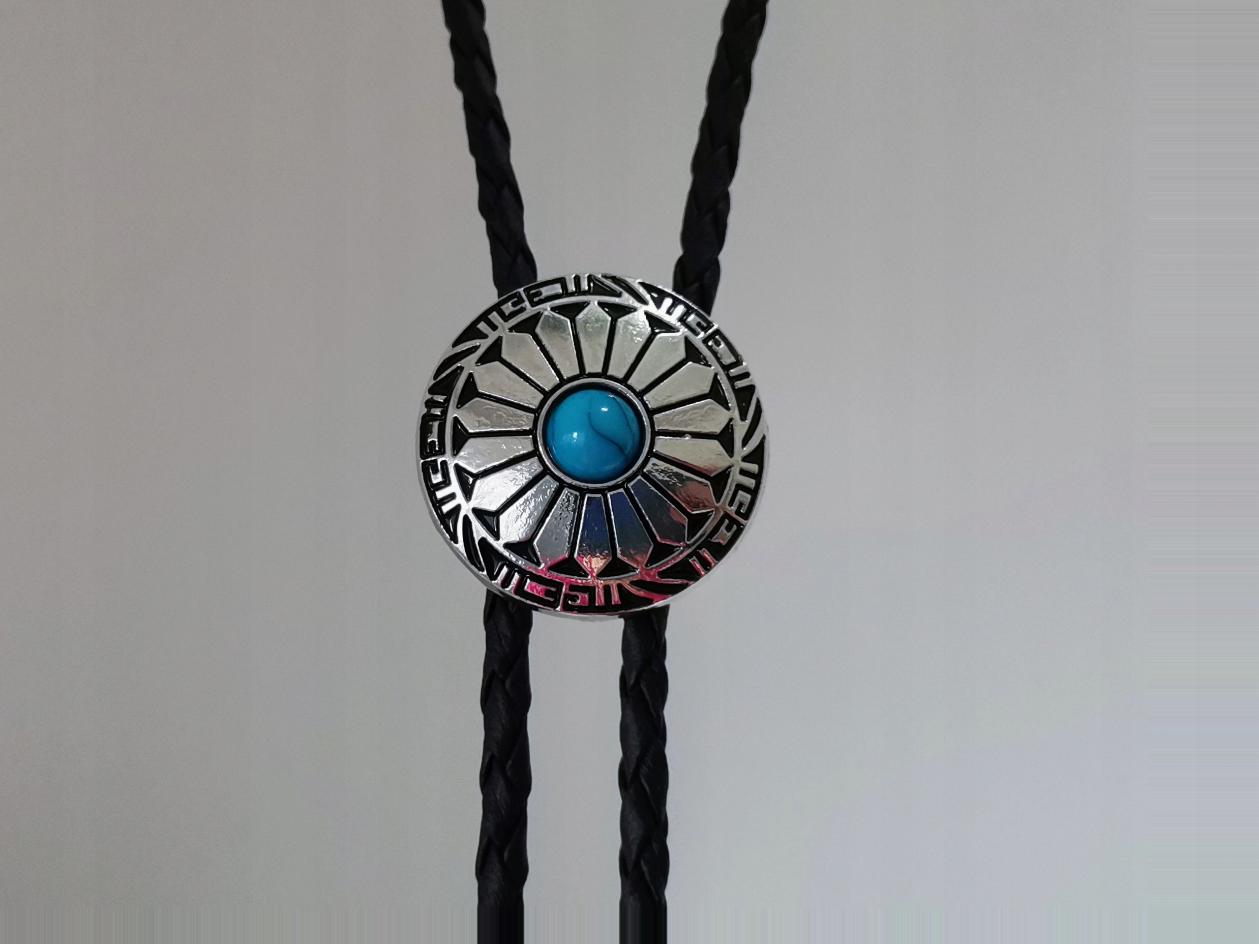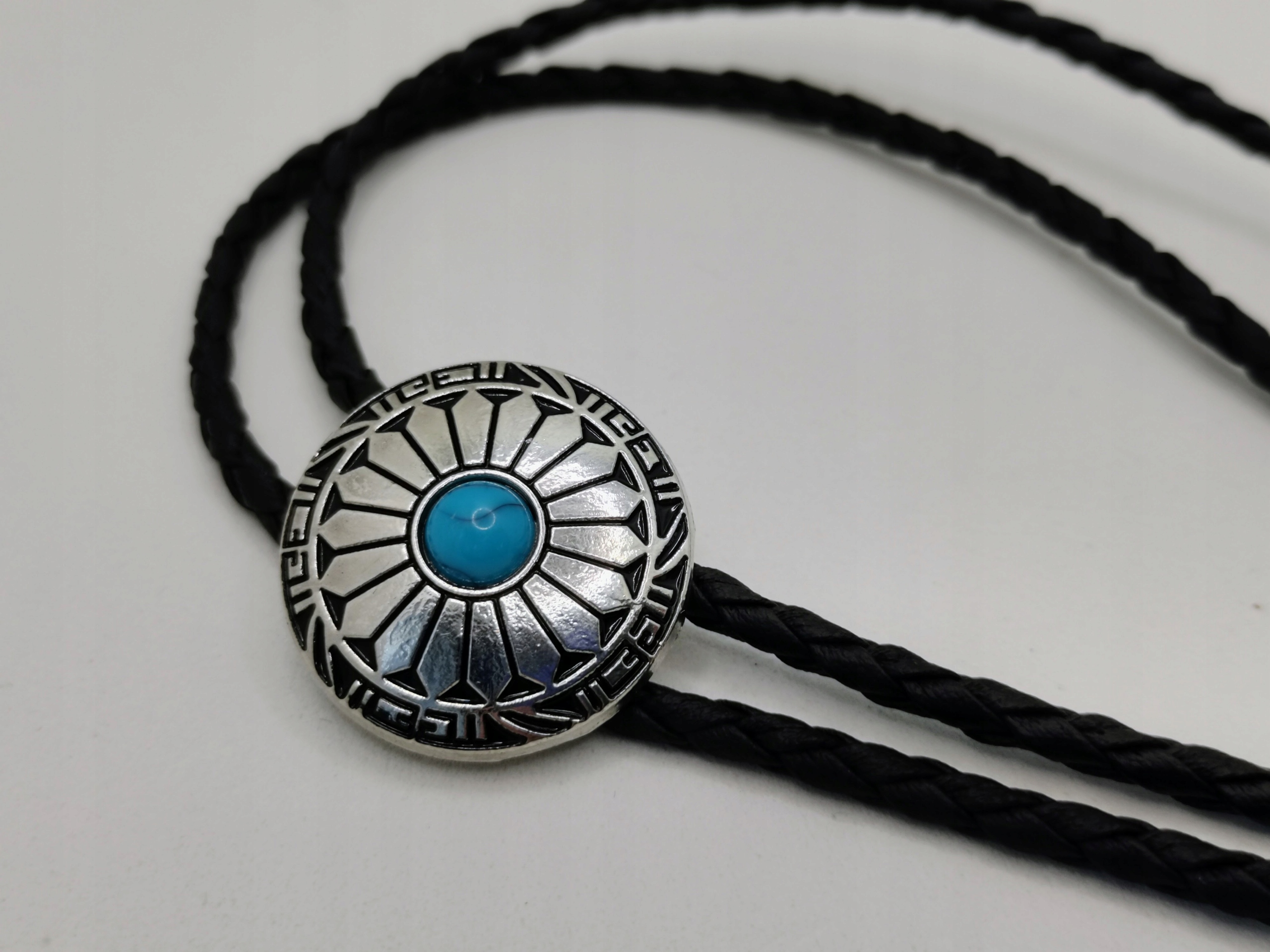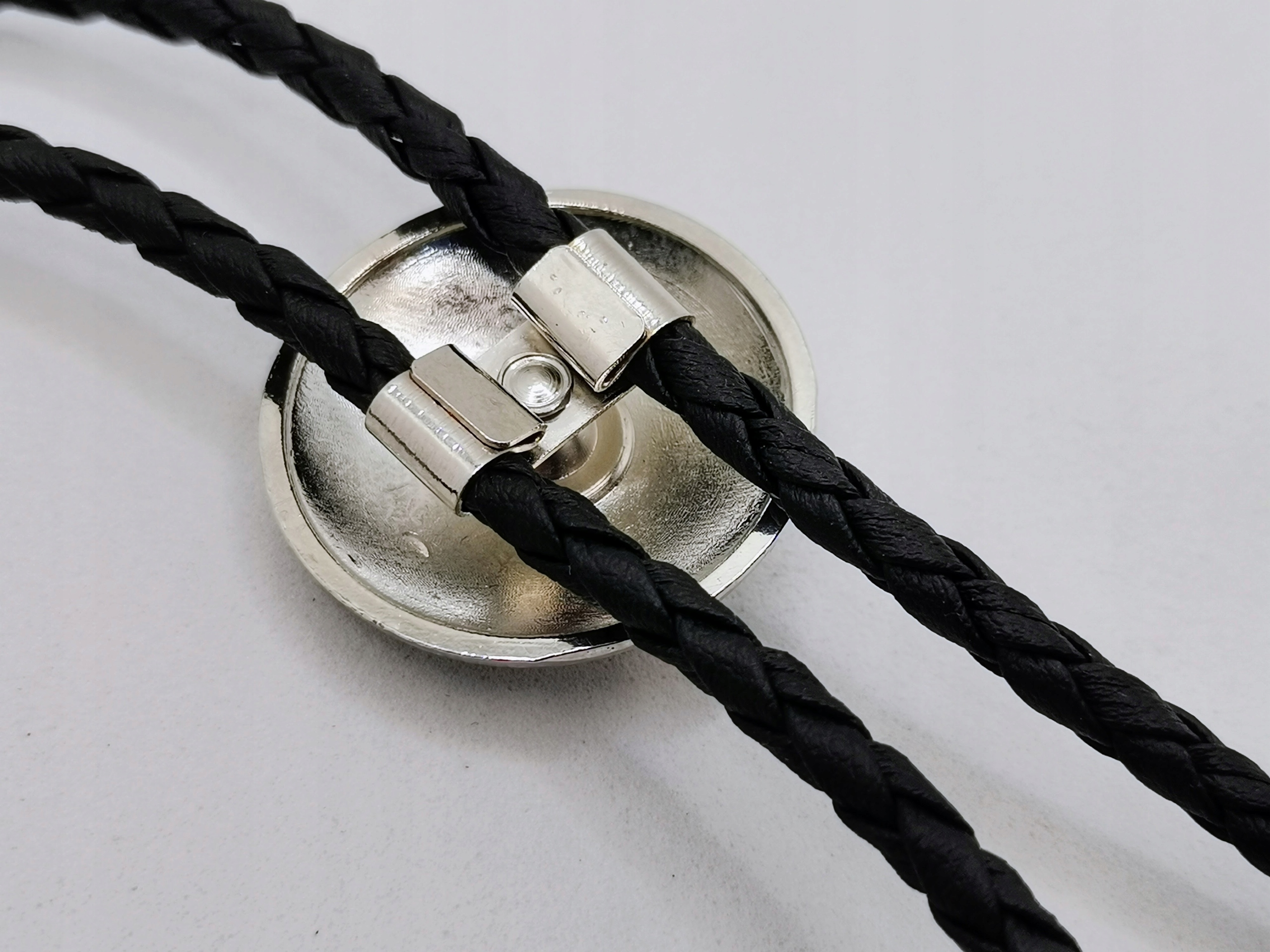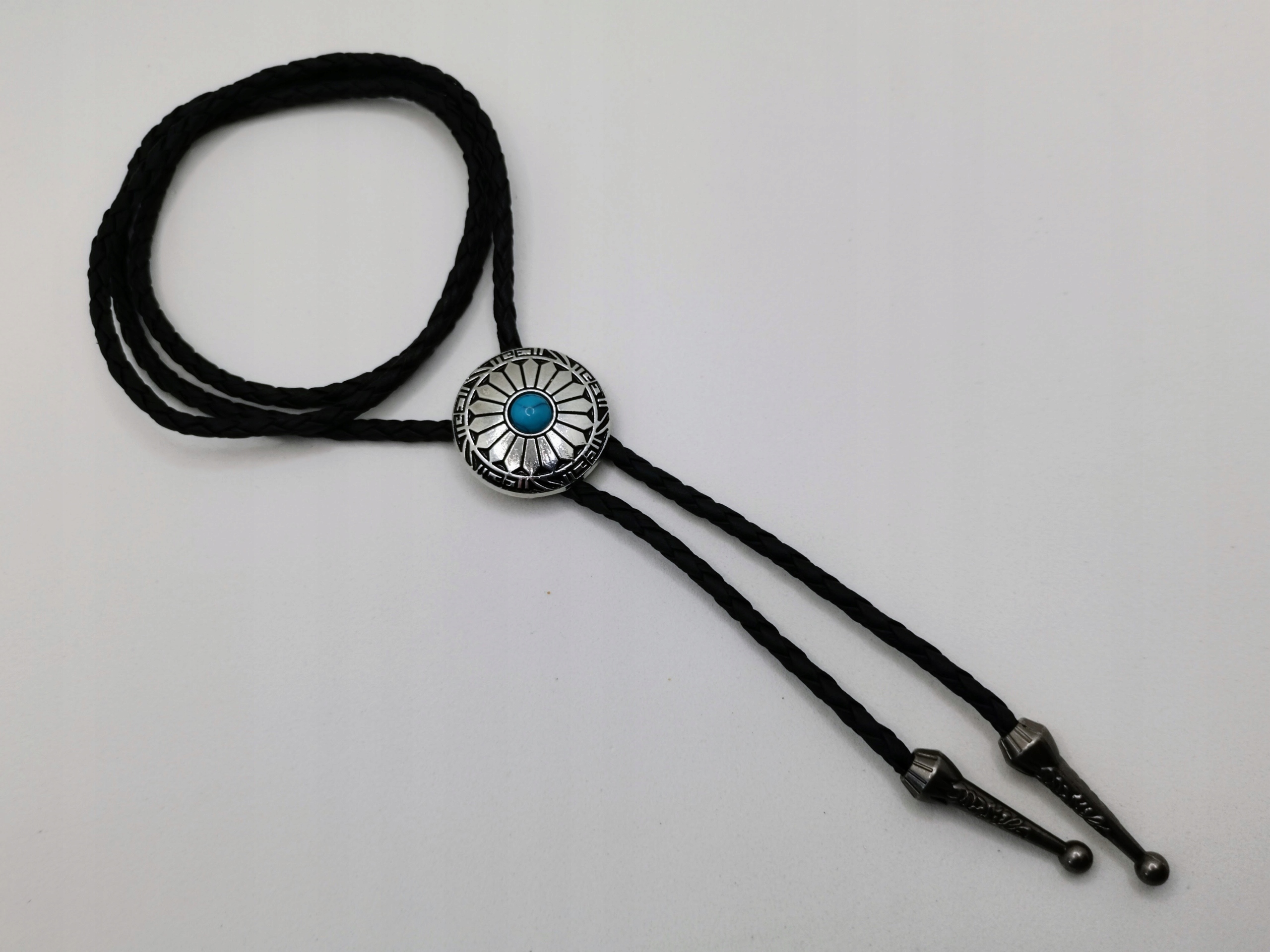 Krawat kowbojski bolo składający się ze skórzanego sznurka o długości 108 cm ,ruchomej zawieszki i ozdobnych metalowych końcówek.