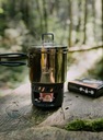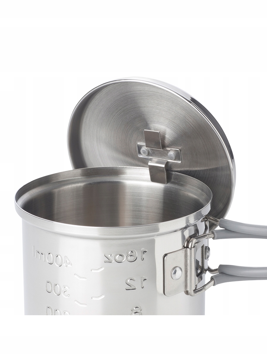 Zestaw do gotowania Esbit Solid Fuel Cookset 585 ml Stainless Steel jest modelem o wysokiej wytrzymałości, co świetnie sprawdzi się w wymagających outdoorowych warunkach. Garnek wykonany został ze stali nierdzewnej, dzięki czemu nie zardzewieje, co jest istotne podczas aktywności w terenie. Na jego powierzchni została wytłoczona podziałka mililitrowa, która pozwoli kontrolować poziom płynów podczas gotowania. Niemieccy projektanci Esbit zdając sobie sprawę, jak istotne jest bezpieczeństwo obsługi gorącego garnka, zastosowali w nim składany uchwyt. Pozwoli on na wygodne przenoszenie garnka wypełnionego potrawami, a za sprawą pokrycia go tworzywem możliwa będzie ochrona przed poparzeniem. Jednocześnie zapewnia on stabilność, która uchroni Cię przed wylaniem gotowanych posiłków. Pokrywka wchodząca w skład zestawu Esbit Solid Fuel Cookset 585 ml Stainless Steel posiada ciekawą funkcję. Specjalnie wyprofilowany kawałek stali pozwoli na umieszczenie jej na garnku bez konieczności poszukiwania miejsca, gdzie można byłoby ją odłożyć. Dzięki temu nie trzeba kłaść jej na trawie, czy ziemi, gdzie mogłaby się zabrudzić.