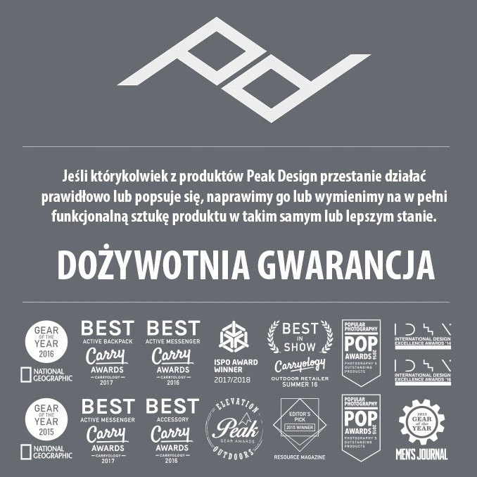 Produkty Peak Design charakteryzują się nie tylko świetnym wykonaniem i przemyślaną konstrukcją. Ich wytrzymałość jest wręcz legendarna, a najlepszym potwierdzeniem tej tezy jest fakt, iż producent udziela na produkt dożywotniej gwarancji.