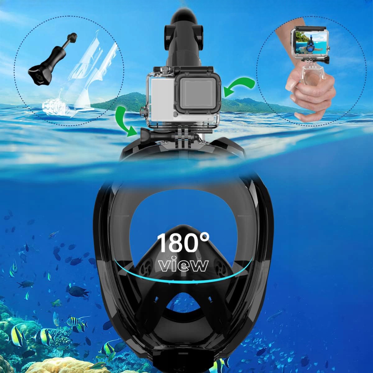 ◉ Uchwyt do montażu kamery - pozwala na uchwycenie najpiękniejszych widoków pod wodą (kamera ani wodoodporna obudowa nie są dołączone do zestawu).