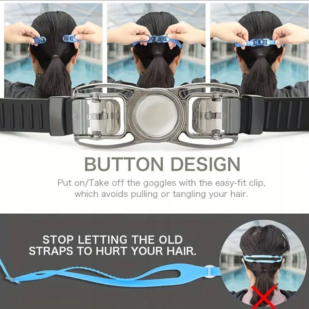 Nie musisz już naciągać niewygodnych pasków silikonowych przy zakładaniu okularów pływackich. Przycisk ONE-KLICK umożliwia wygodne i szybkie założenie i zdjęcie okularów, łącząc pasek silikonowy z tyłu głowy. Od teraz zakładasz i ściągasz okulary jednym kliknięciem.
