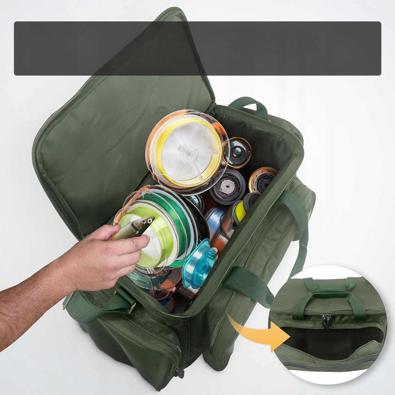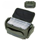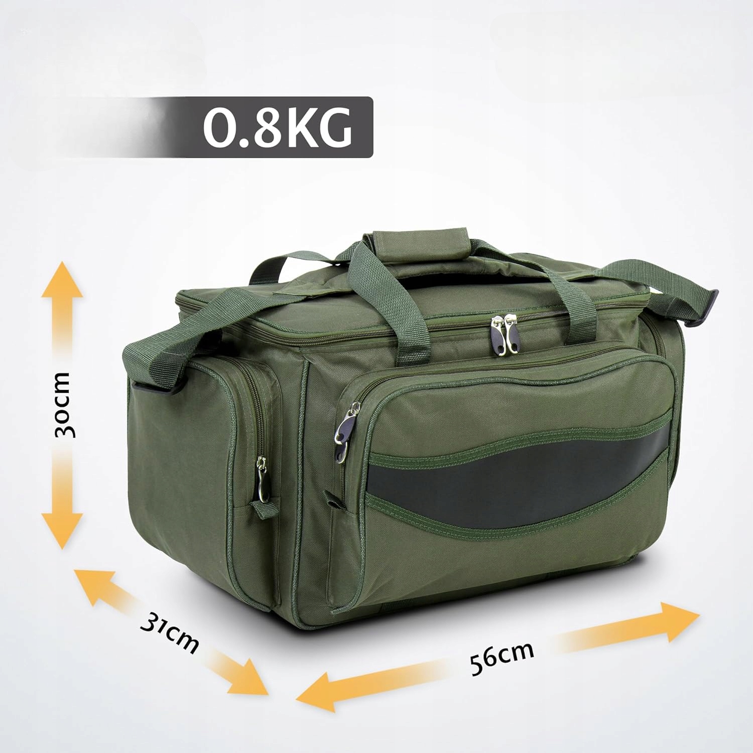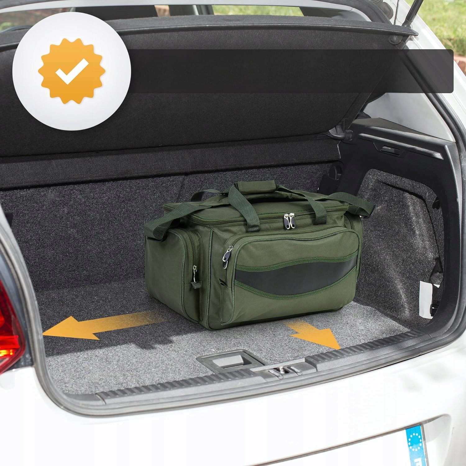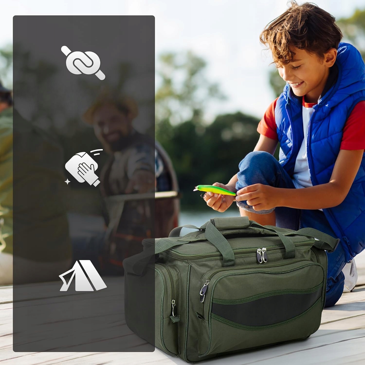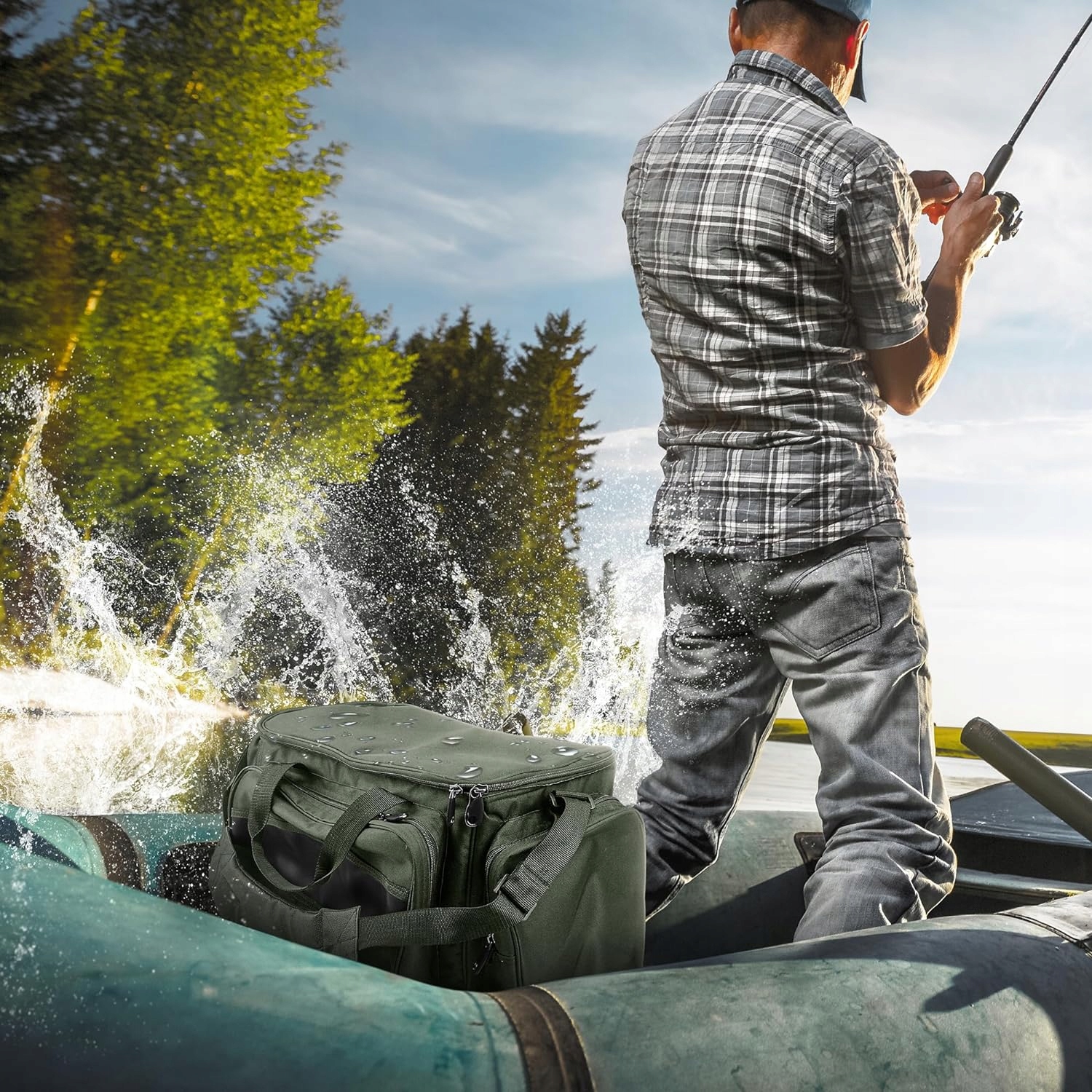 Ta praktyczna torba wędkarska oferuje mnóstwo miejsca na wszystko, co musisz mieć przy sobie podczas wędkowania. Żywność, kulki proteinowe, pudełka z haczykami zapasowymi, ciężarki, spławiki i wiele innych rzeczy będą dobrze posortowane i gotowe do użycia w razie potrzeby. Wytrzymały i wodoodporny materiał zapewnia ochronę zawartości torby nawet podczas deszczu i rozprysków wody. Kilka bocznych kieszeni zapinanych na zamek oferuje dodatkową przestrzeń na drobne przedmioty. Wyściełane uchwyty do noszenia zapinane na rzepy i wyściełany, regulowany pasek na ramię ułatwiają przenoszenie.