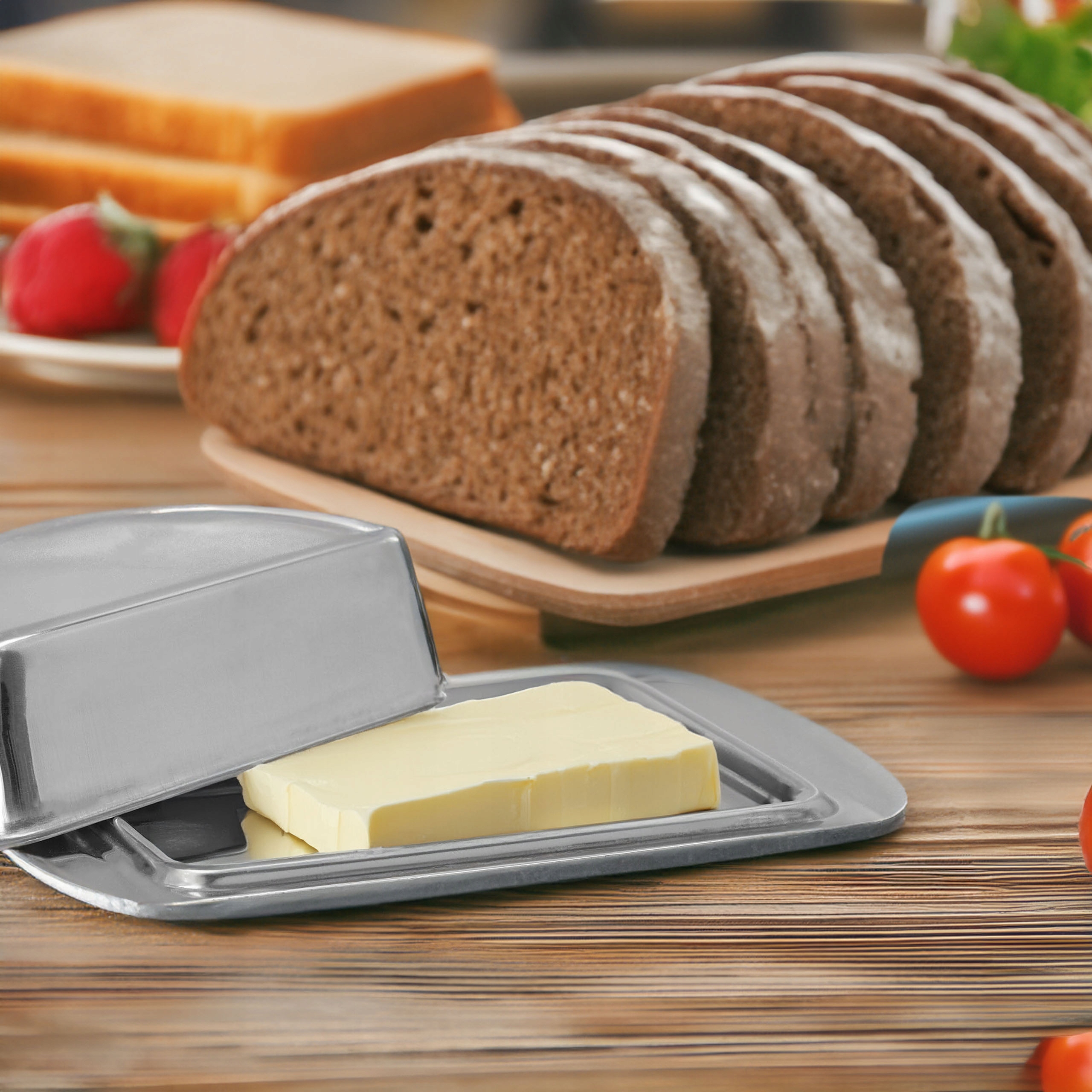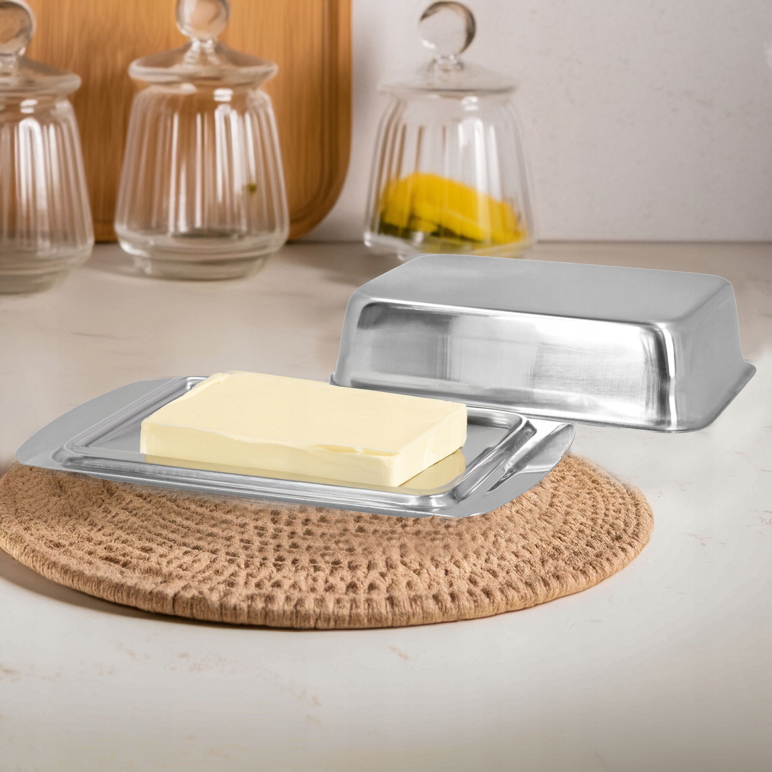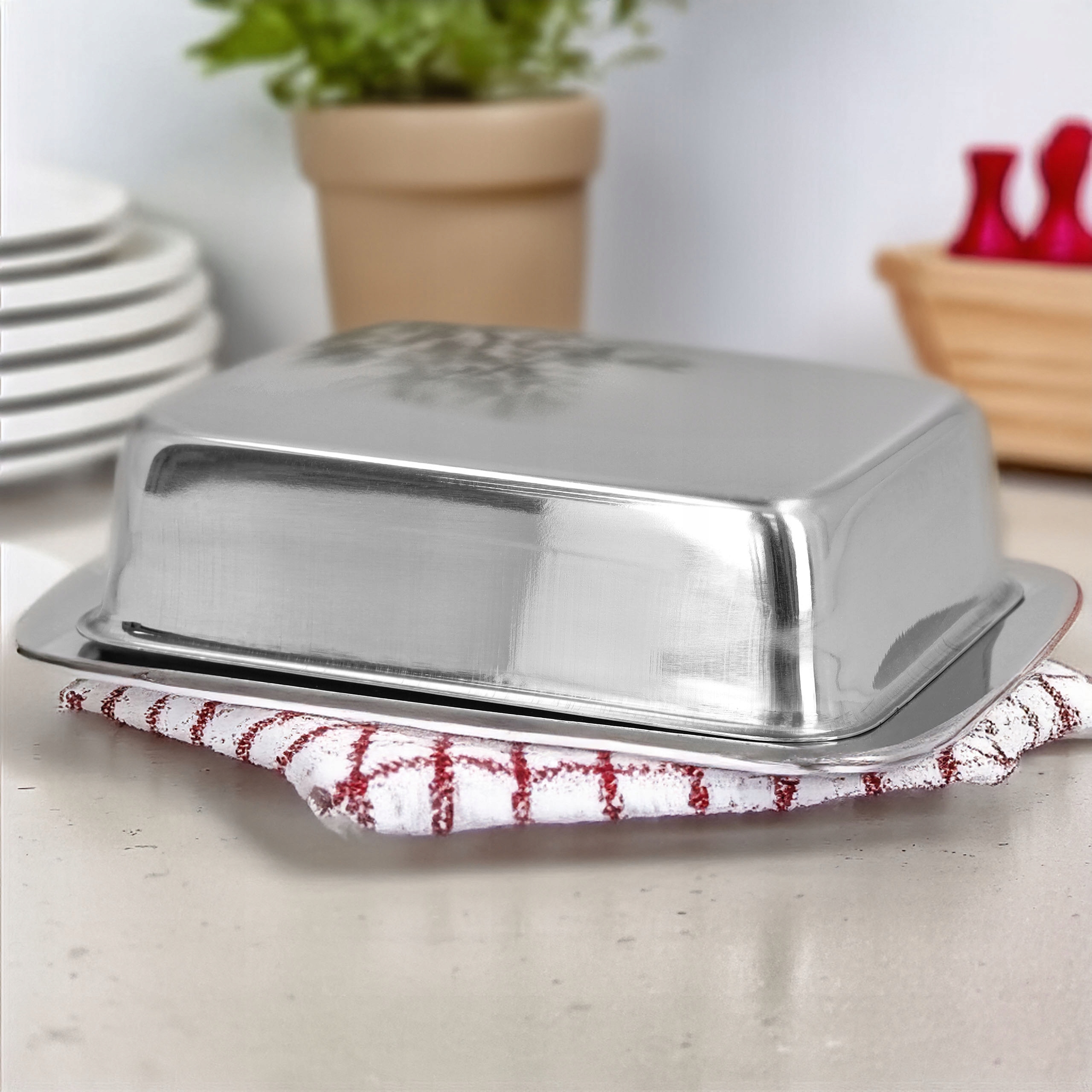 Maselniczka jest nie tylko elegancka, ale także bardzo praktyczna. Jej wymiary są idealne do przechowywania standardowej kostki masła, a stalowa pokrywa chroni masło przed zewnętrznymi czynnikami, utrzymując jego świeżość.