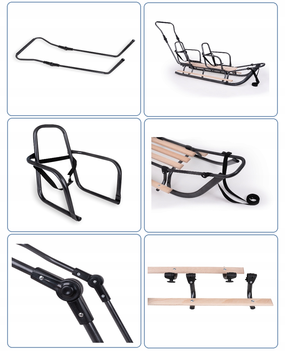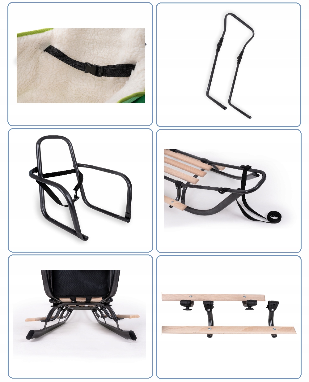 Sanki posiadają pchacz i oparcie, które można bardzo łatwo zdemontować.