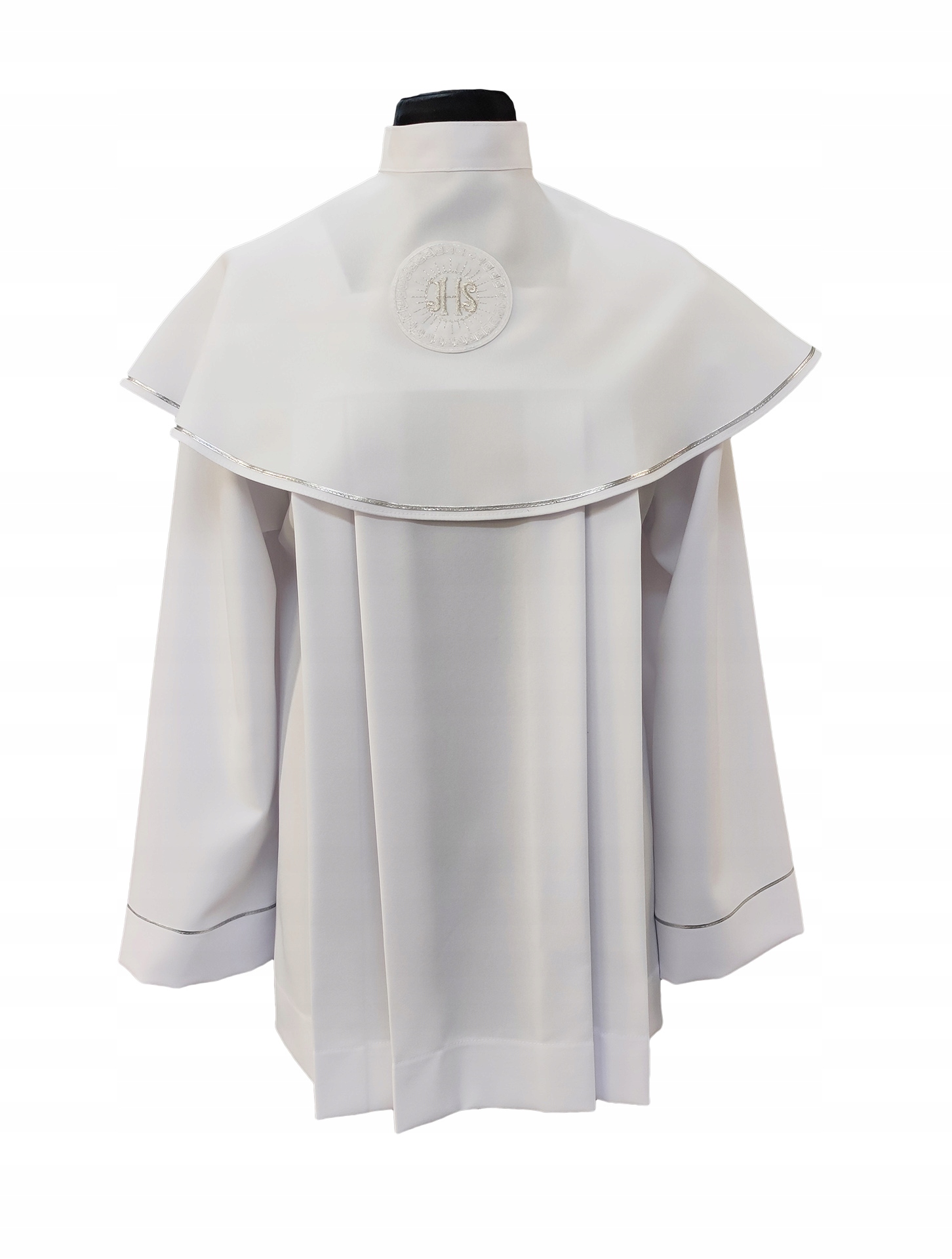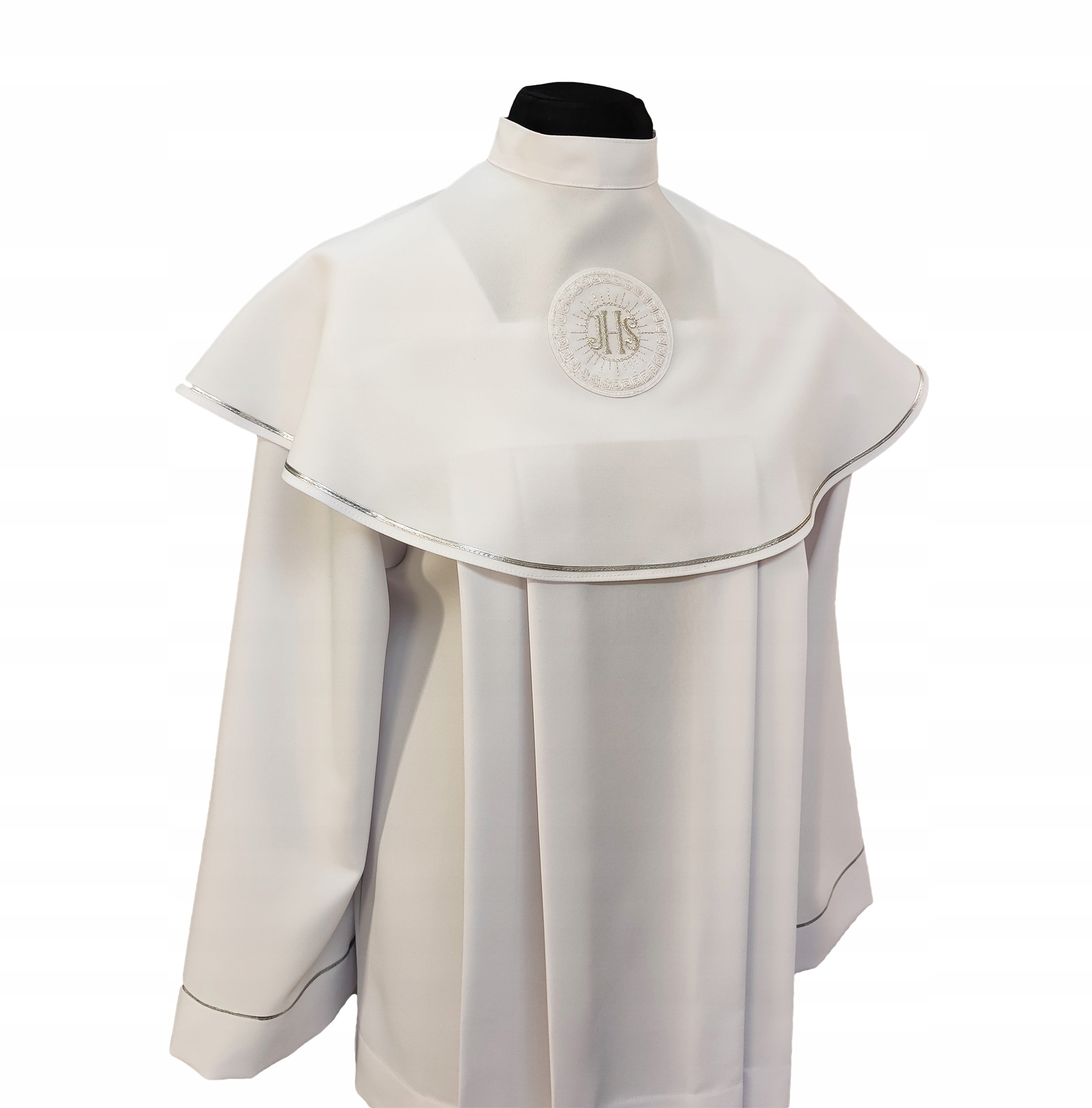 Dwu elementowa Komża Komunijna z kołnierzem. Kołnierz zapinany z tyłu, z przodu naszyta srebrna HOSTIA. Minimalna liczba zdobień, kołnierz i rękawy obszyte srebrną tasiemką. Komża została uszyta z tkaniny syntetycznej typu "strecz". Komża bardzo praktyczna w użytkowaniu, łatwo się pierze, prasuje.