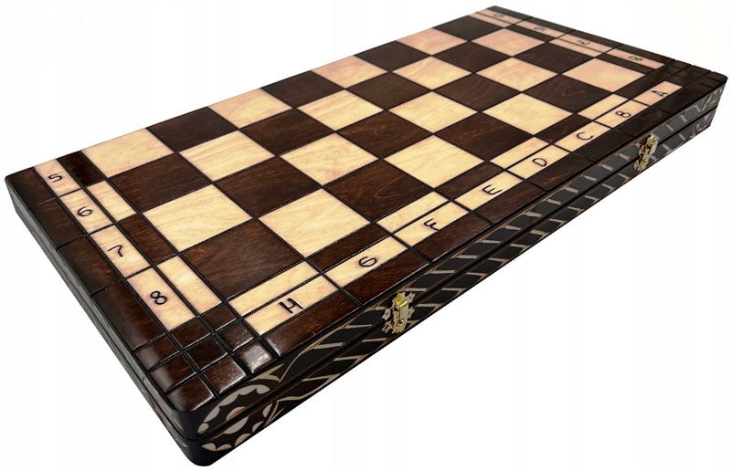 Szachownica wykonana z drewna i sklejki wypalana, bejcowana, rzeźbiona oraz lakierowana. Środek wyłożony czerwoną wkładką.