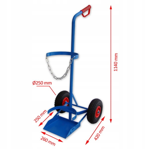 Wózek do transportu butli gazowych. Solidna, stalowa konstrukcja, zabezpieczenie butli przed spadaniem za pomocą łańcucha.