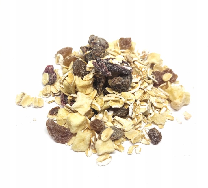 płatki owsiane 50 %, rodzynki niesiarkowane, daktyl cięty, jabłko kostka, żurawina cięta
