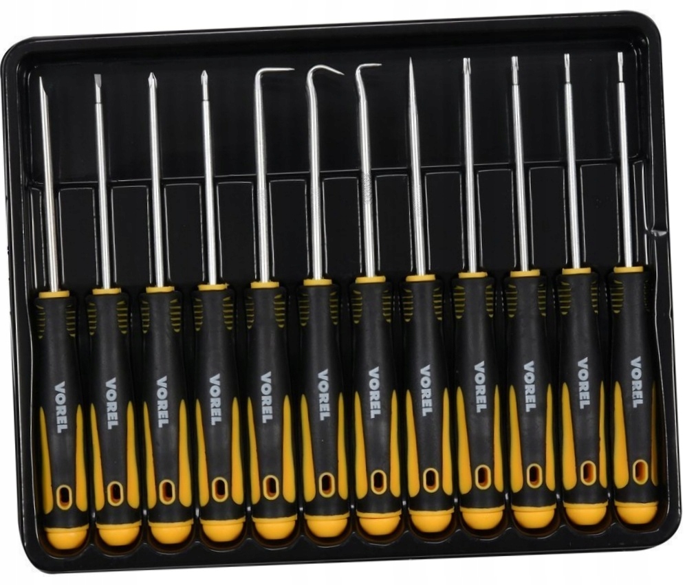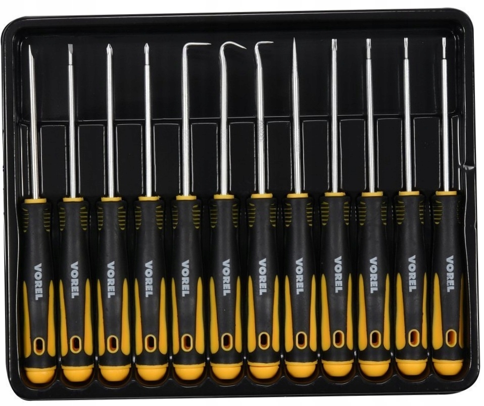 Zestaw 12 precyzyjnych wkrętaków i haczyków przeznaczonych do zastosowań uniwersalnych w różnych branżach.