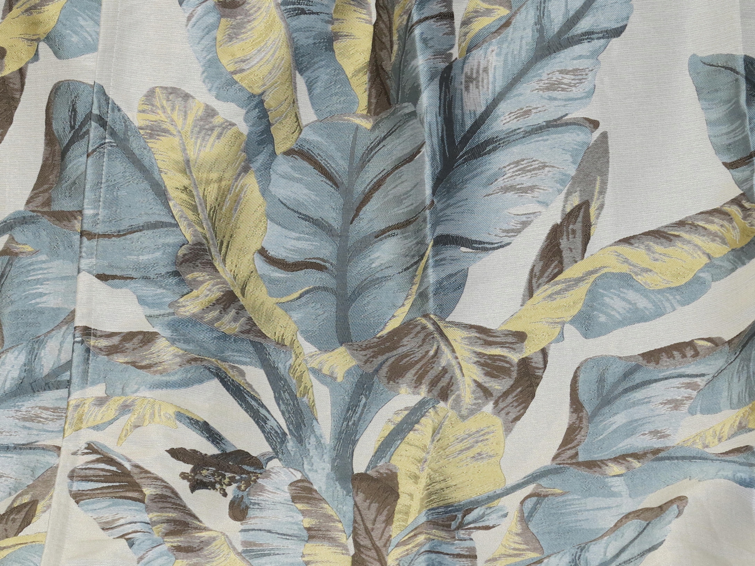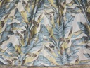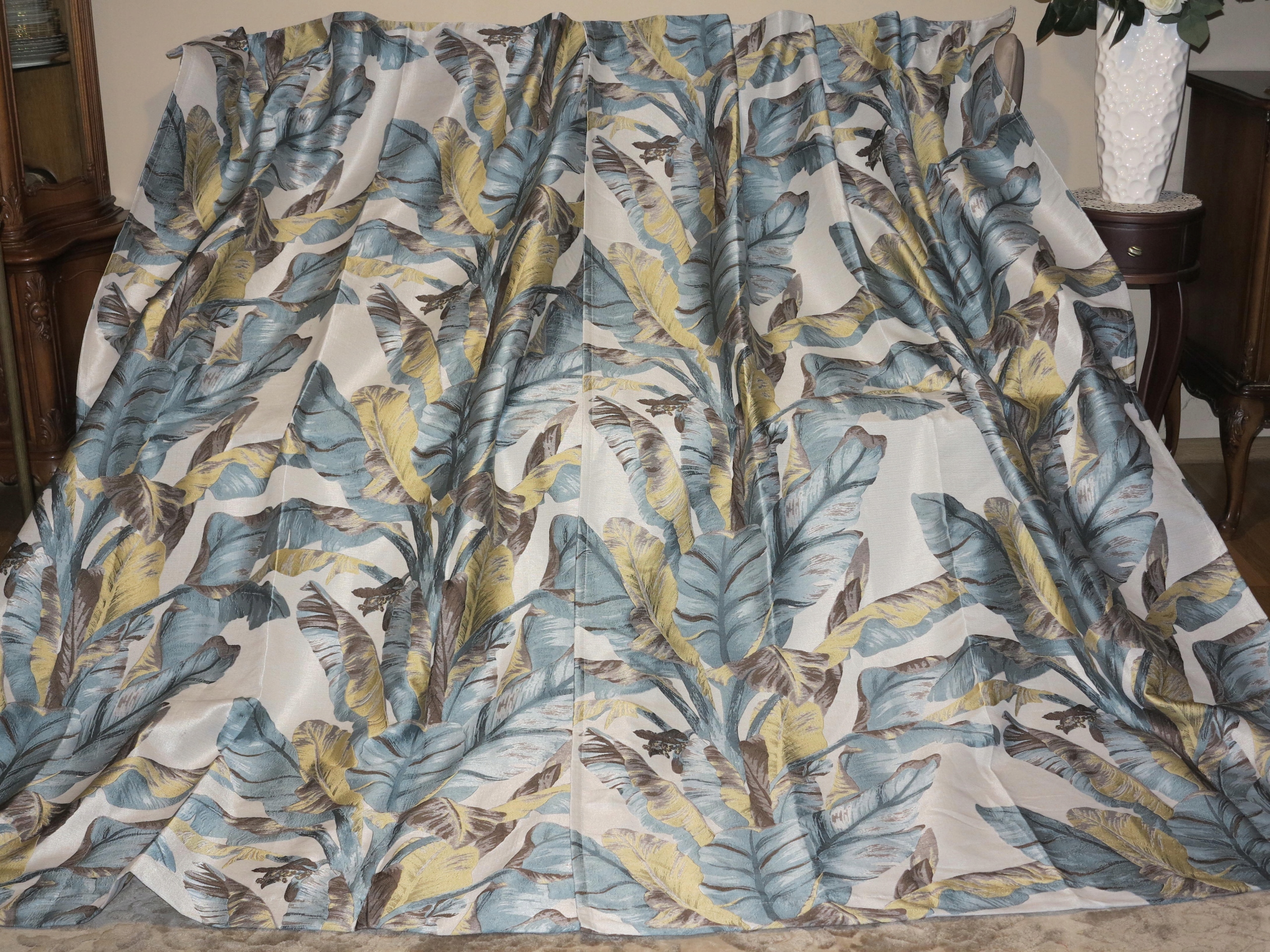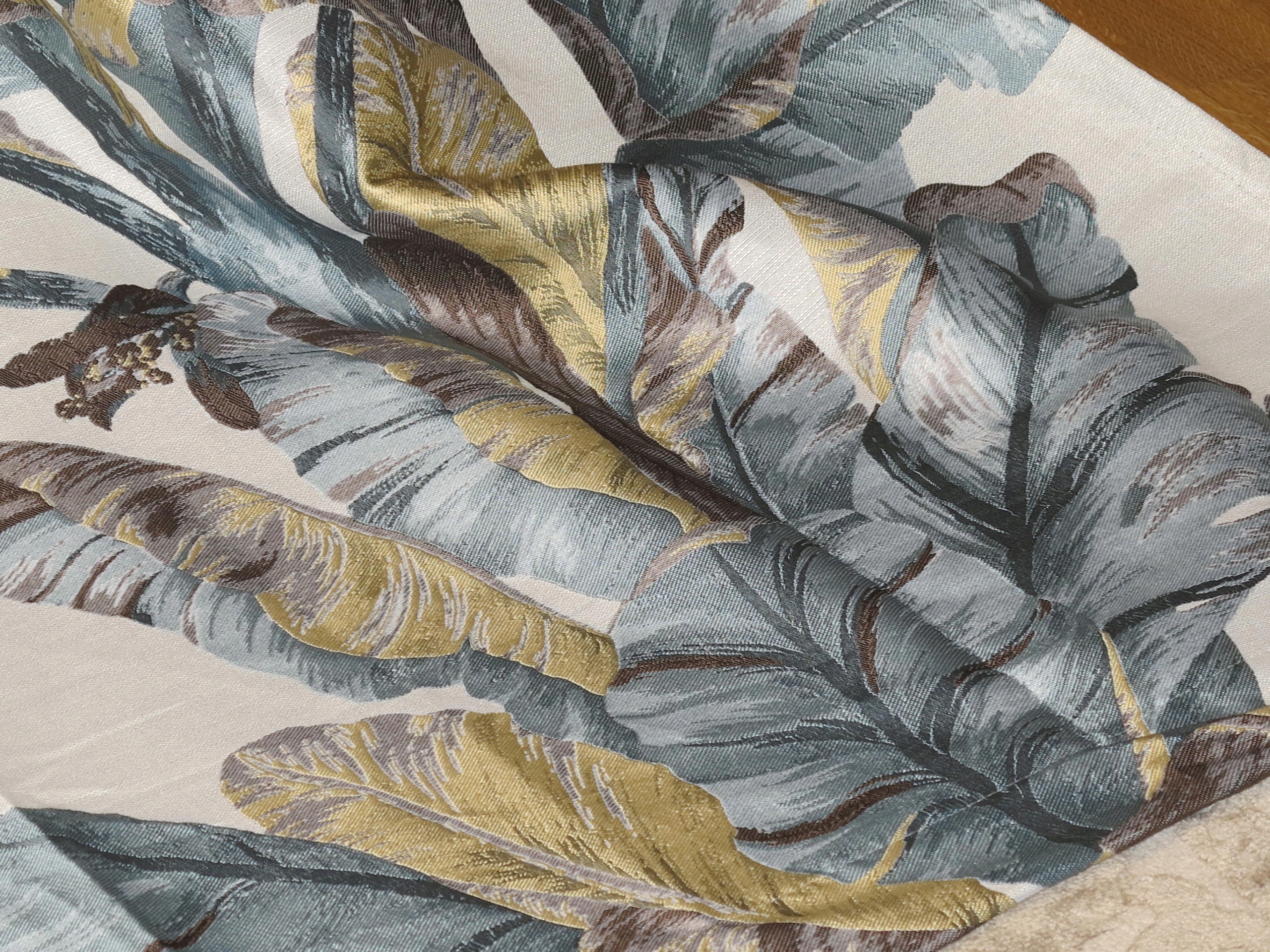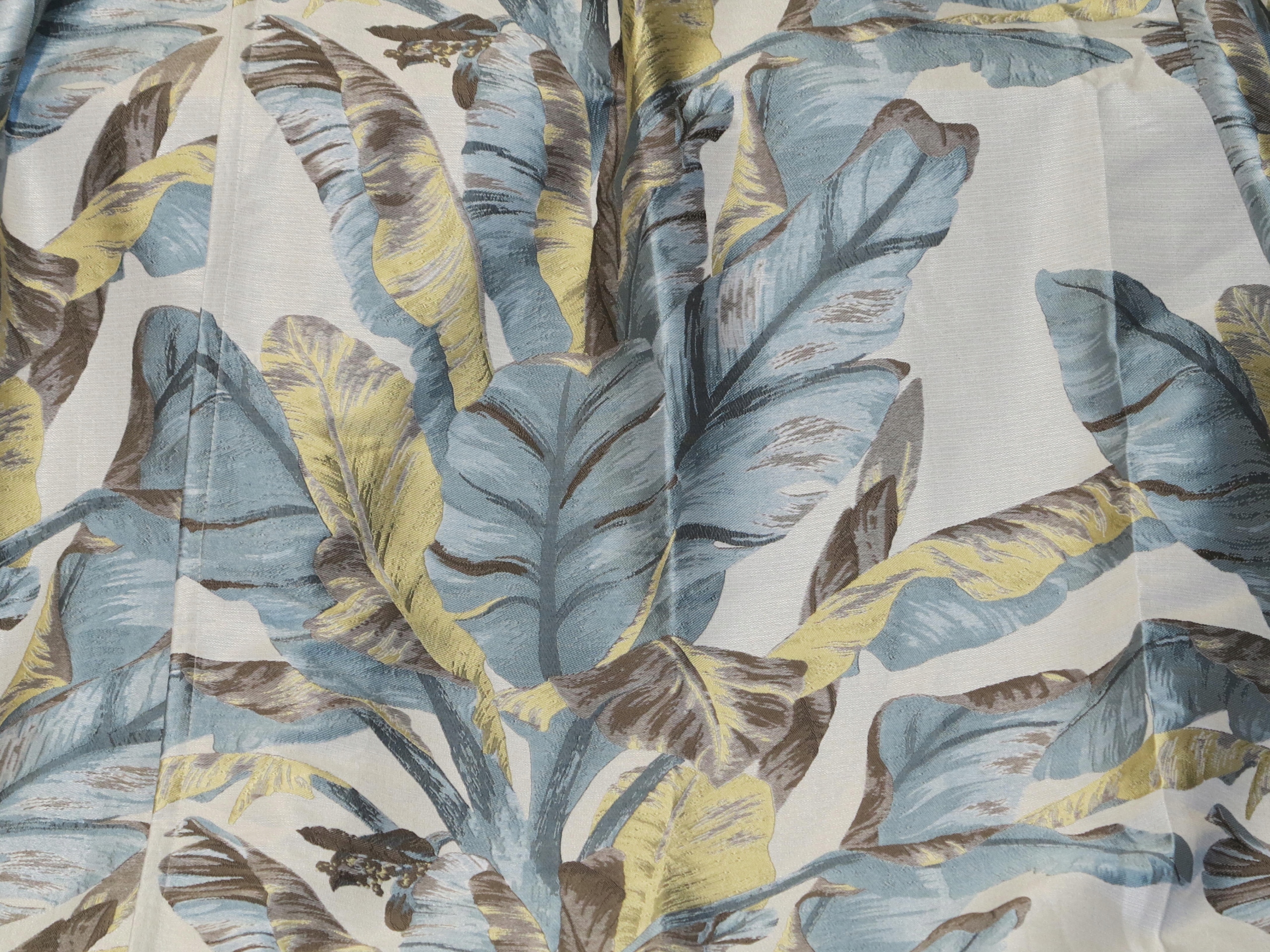 KID- KOMPLET PRZEPIĘKNYCH, GRUBSZYCH ZASŁON W BARDZO DEKORACYJNE DUŻE LIŚCIE, W KOLORACH BŁĘKITU, ZŁOTA I BRĄZU. TŁO W KOLORZE GOŁĄBKOWYM.