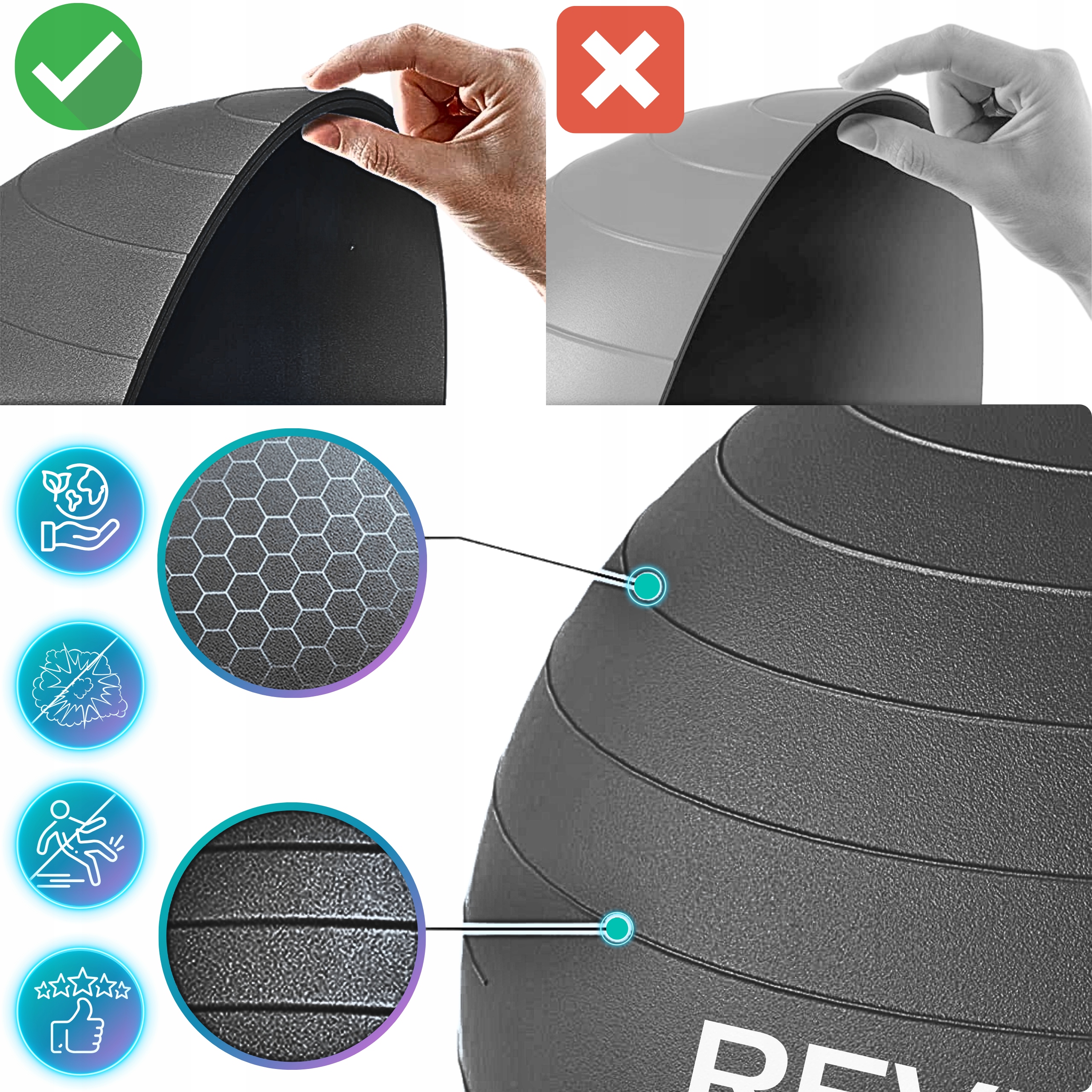 ✅ TECHNOLOGIA ANTI-BURST - Jeśli obawiasz się, że Twoja piłka pęknie, to możesz spać spokojnie :) REVITY GYM BALL wyposażono w technologię Anti-Burst. Co to dla Ciebie oznacza? Jeśli z jakiegoś powodu dojdzie do uszkodzenia powierzchni, to materiał nie pozwala na gwałtowną utratę powietrza. Dzięki temu możesz ćwiczyć bezpiecznie bez obawy o groźną kontuzję.