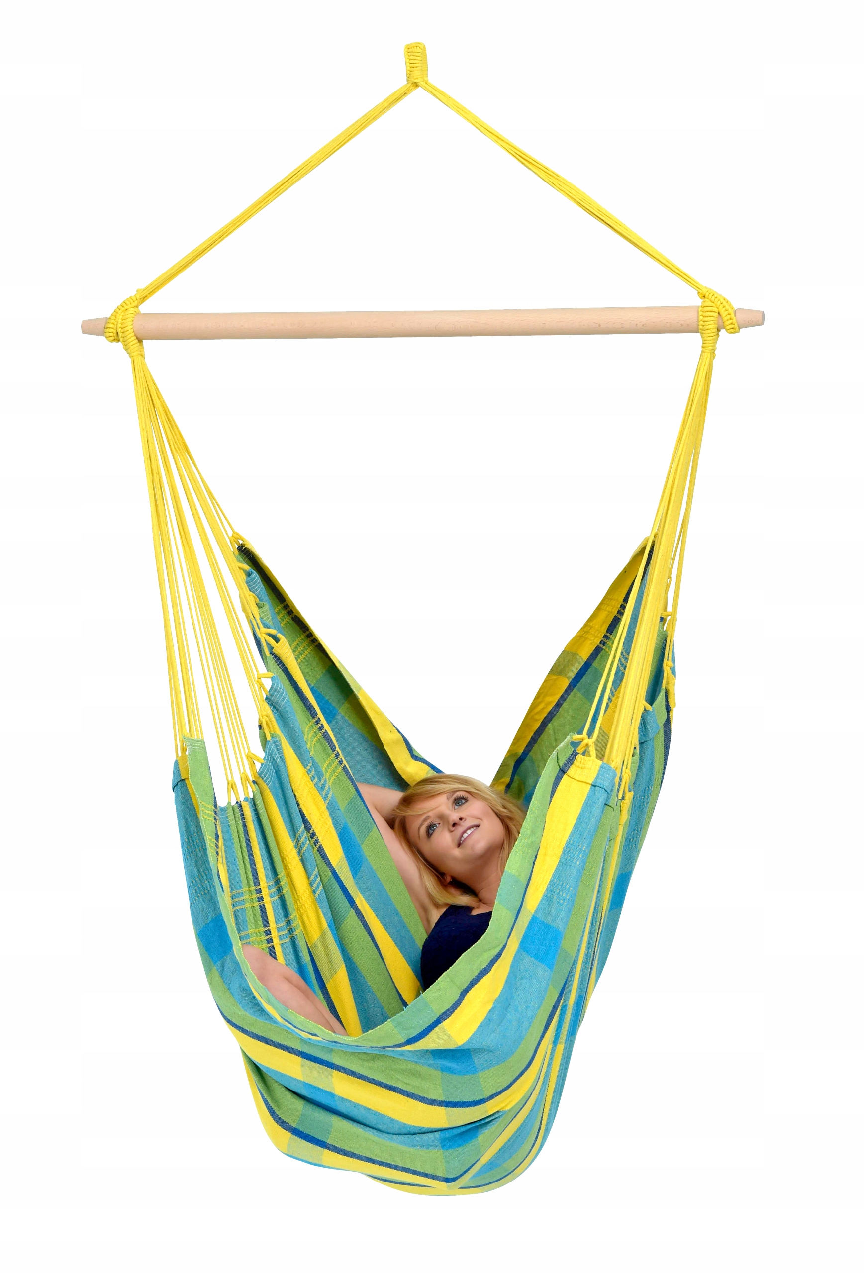 Oryginalny fotel hamakowy marki Amazonas wyprodukowany w Brazylii z najwyższej jakości bawełny (85%) i poliestru (15%) dla większej wytrzymałości i lepszego odprowadzania wilgoci. Drążek wykonany został z drewna bukowego z certyfikatem FSC, po obu stronach posiada nacięcia zapobiegające zsunięciu się szurów mocujących. Fotel idealnie sprawdzi się niemal w każdych warunkach, w ciepłe dni można go zawiesić na balkonie lub w ogrodzie nie gałęzi drzewa, a jesienią i zimą z powodzeniem posłuży w domu zawieszony do sufitu. Dedykowany dla osób dorosłych, dzieci powyżej 3 roku życia i młodzieży.