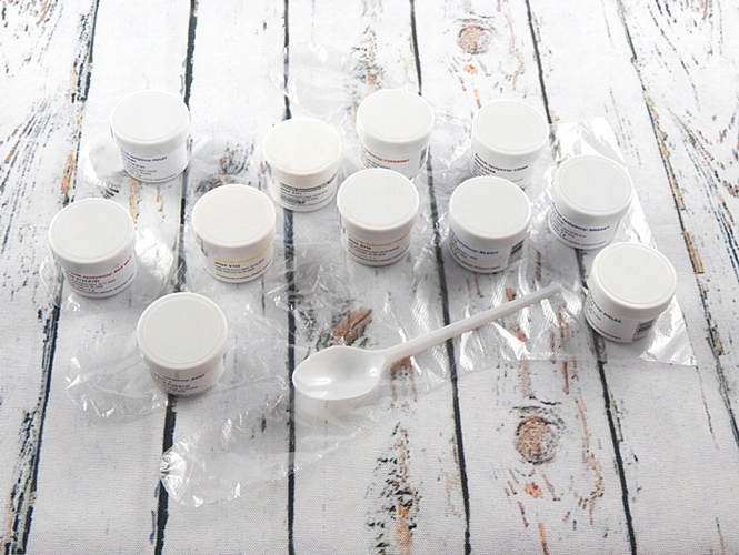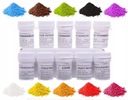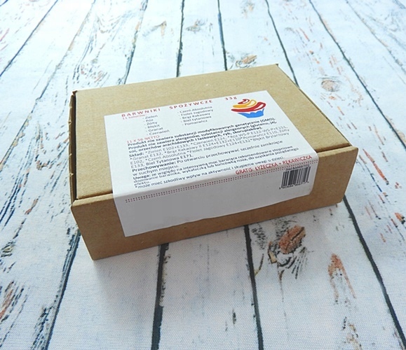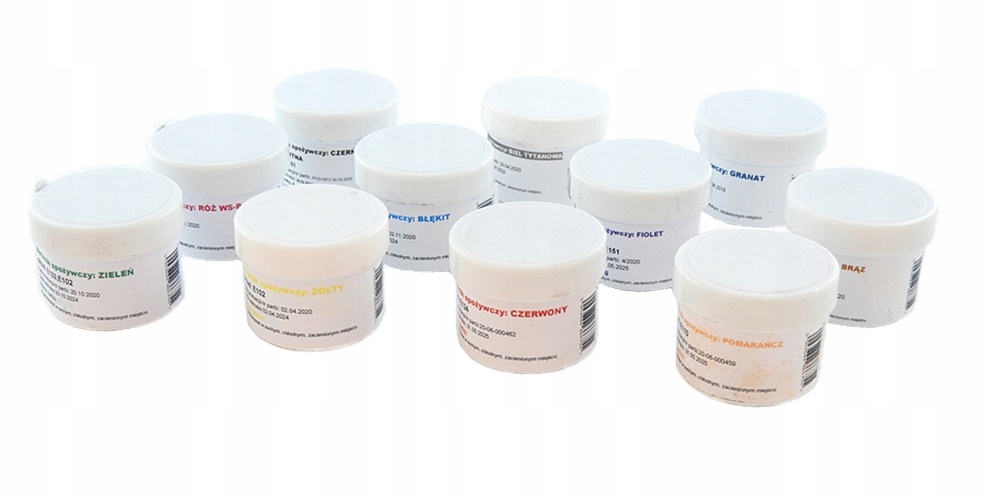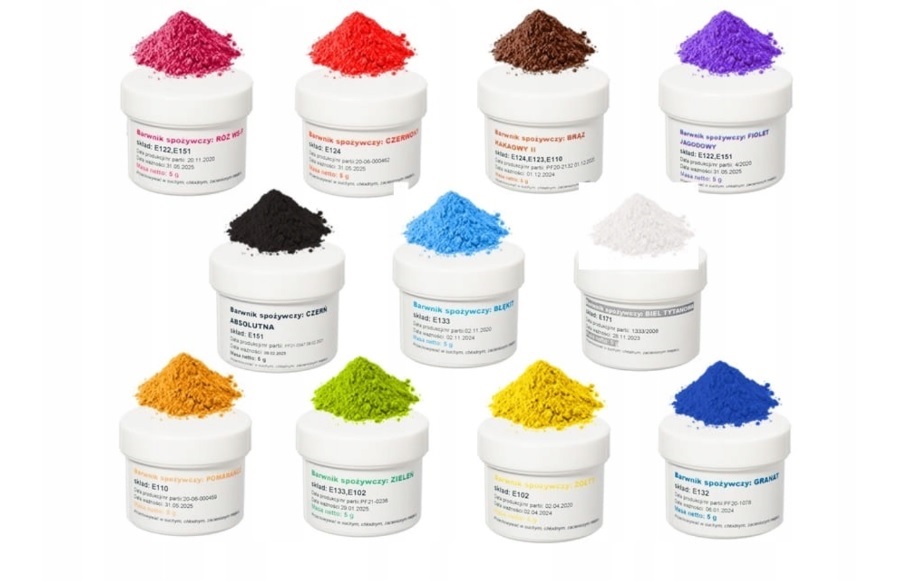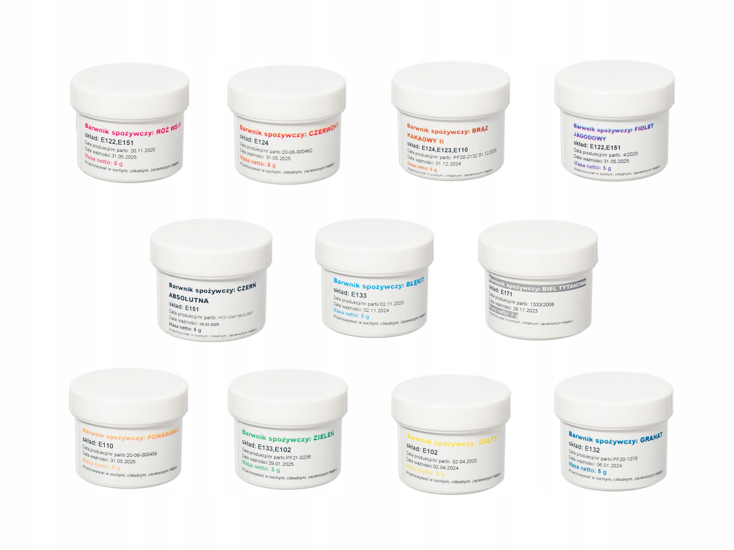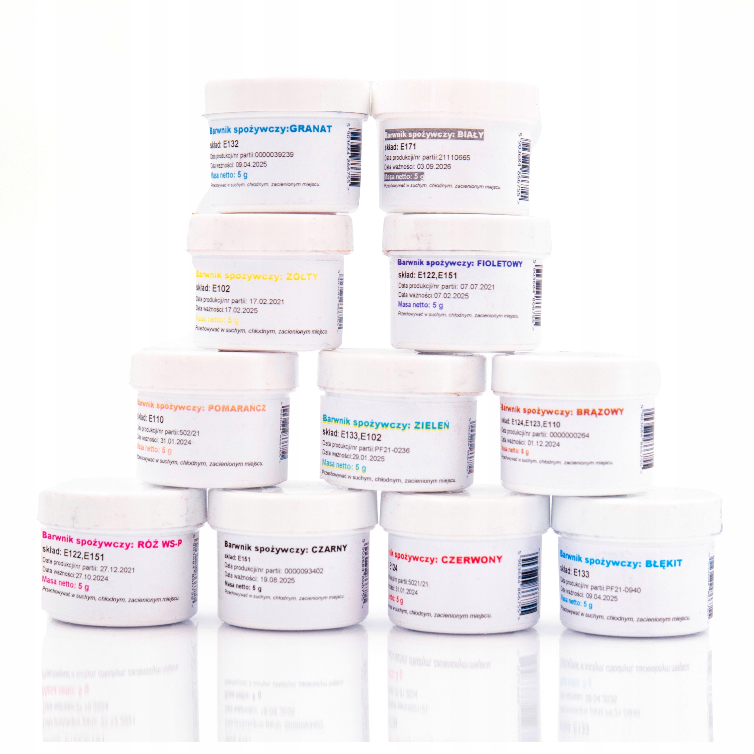 Dokładna specyfikacja: 1.Biel E170; 2. Tartazyna E102; 3. Żółcień pomarańczowa E110; 4. Czerwień koszenilowa E124; 5. Różowy E122, E151; 6. Błękit brylantowy E133; 7. Brąz kakaowy E110,E124,E123; 8. Zieleń pistacjowa E102,E133 ; 9. Czerń E155,E151,E122,E132,E133; 10 Fiolet jagodowy E151,E122 11. Granatowy E132