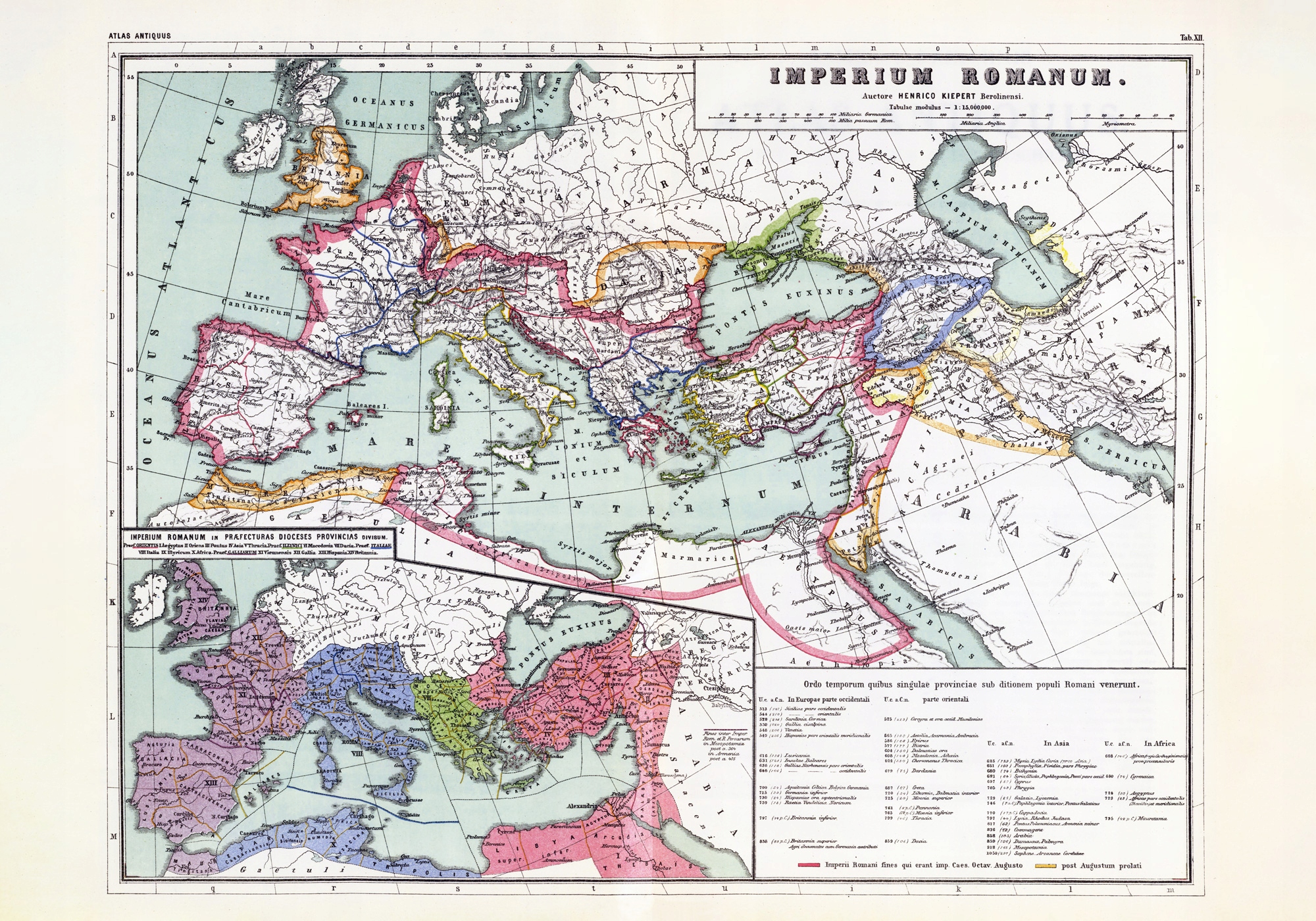 Reprodukcja mapy z roku 1903: Mapa Imperium Rzymskiego. Tytuł oryginału: Imperium Romanum in praefecturas, dioceses, provincias divisum. Autorstwa Heinricho Kieperta.