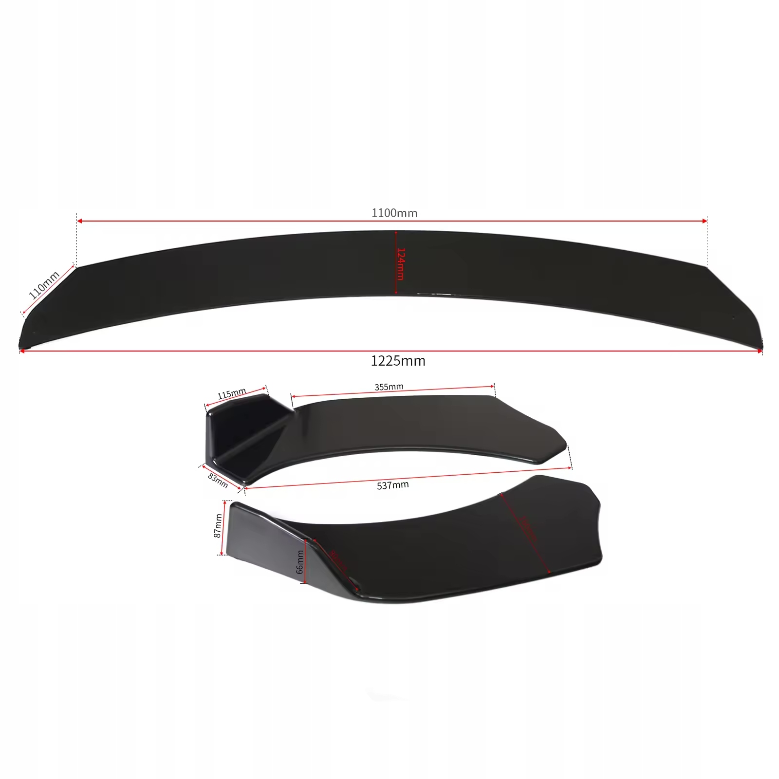 Uniwersalny splitter zderzaka przedniego w kolorze czarnym (połysk). Zestaw składa się z trzech części, które umożliwiają dopasowanie dokładki do samochodu.