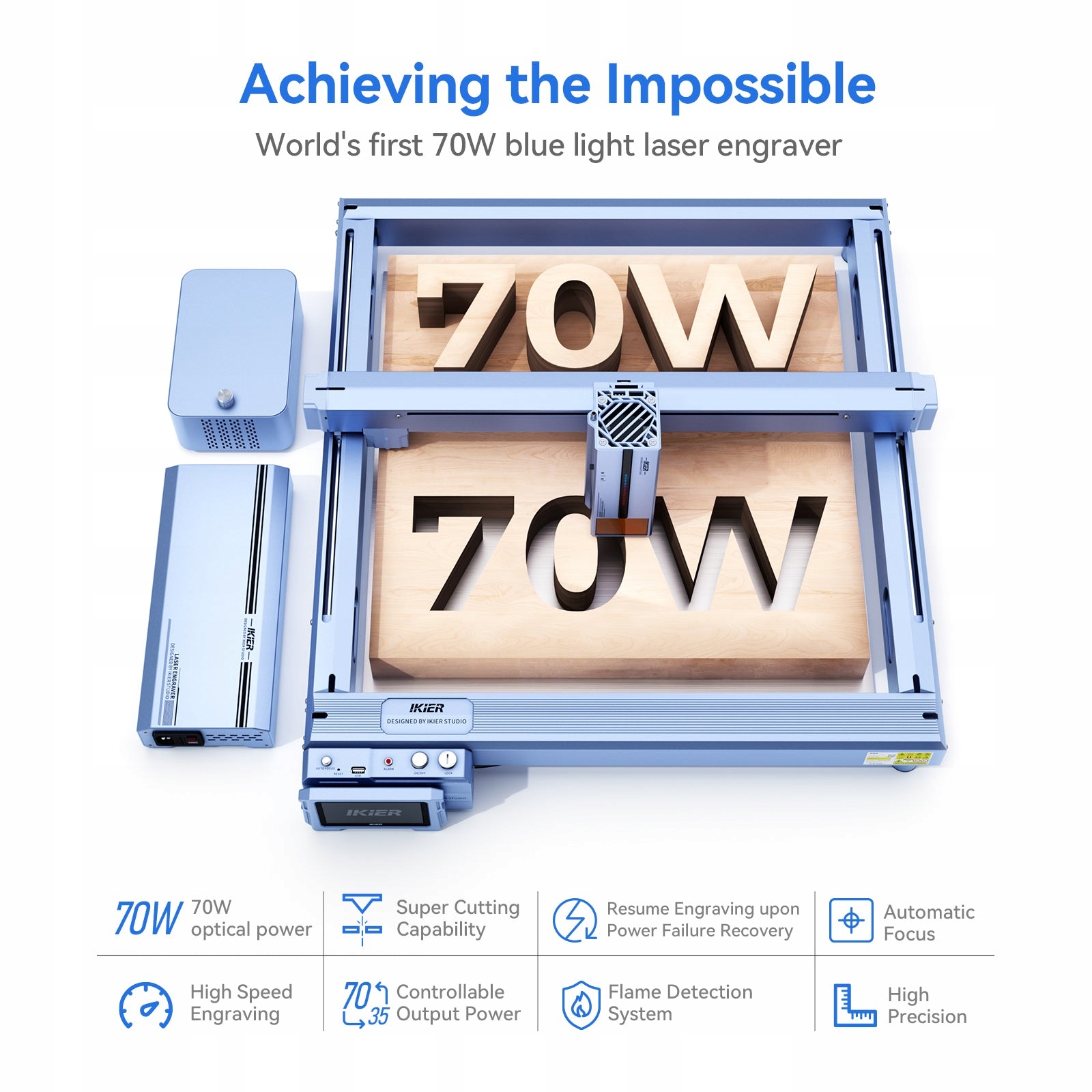 Najbardziej inteligentna maszyna do grawerowania laserowego: Jako najinteligentniejsza na świecie maszyna do grawerowania laserowego, IKIER K1 przoduje dzięki takim funkcjom, jak wznawianie grawerowania po wyłączeniu zasilania, autofokus jednym kliknięciem, automatyczne cięcie wgłębne, automatyczne wspomaganie powietrzem, wykrywanie płomienia i pozycjonowanie w podczerwieni. Osiąga ultraszybką pracę z prędkością 900 mm/s.