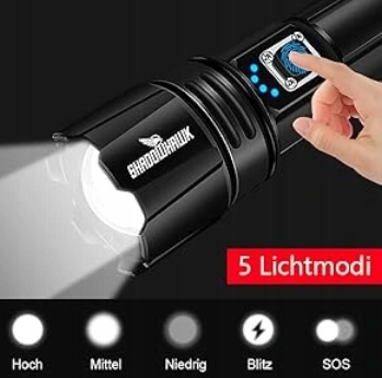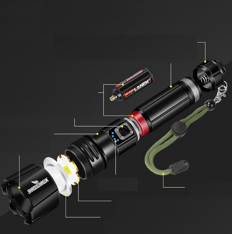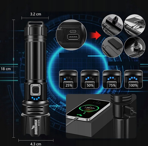 latarka LED została wyposażona w wyjątkowy wyświetlacz LCD, który pozwala na kontrolowanie pozostałej mocy. Latarki zostały całkowicie ulepszone, aby skrócić czas ładowania i wydłużyć żywotność. Do 12 godzin (tryb niski) zapewnia mocną, niesłabnącą jasność. Wbudowany interfejs USB, wygodniejsze ładowanie.