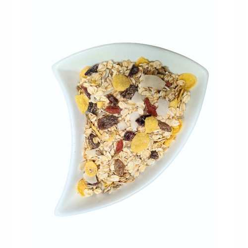 Skład: płatki owsiane, rodzynki, płatki żytnie, żurawina cięta, płatki kukurydziane, chipsy kokosowe, jagody goji, słonecznik łuskany, nasiona chia, łuski babki jajowatej.