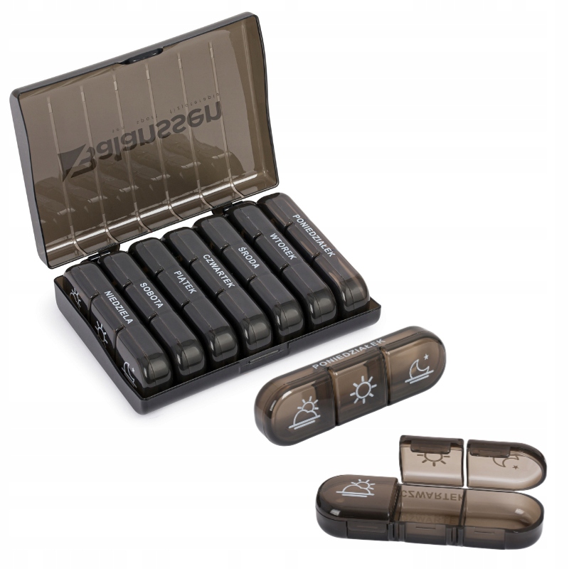 Każdy pojemnik na dzień tygodnia ma czarny dymny kolor i jest oznaczony nazwą tego dnia. Każda organizer dnia posiada 3 opisane przegrody z podziałem na porę dnia (rano, popołudnie, wieczór INFOGRAFIKI).