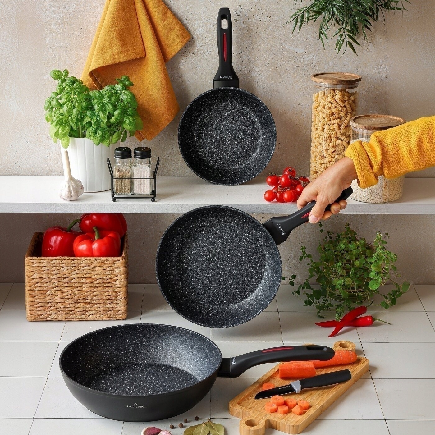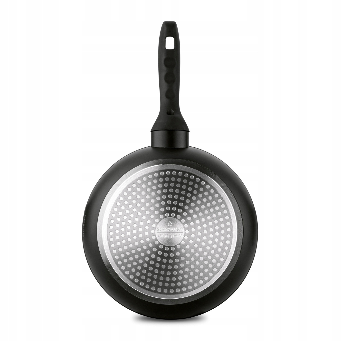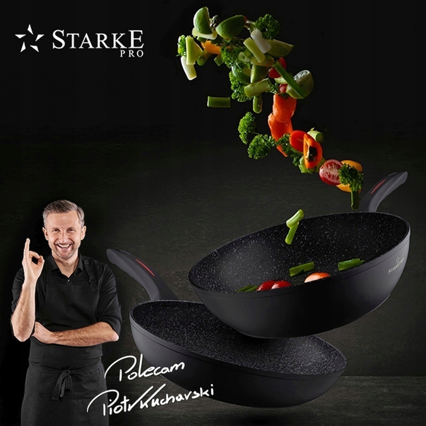 Głęboka patelnia granitowa Starke Pro Piccante 24 x 6,5 cm może być używana na indukcji oraz kuchenkach gazowych, ceramicznych i elektrycznych. Jej korpus został wykuty na gorąco z certyfikowanego aluminium. Dzięki temu jest dobrze wyważony, ciężki i ma solidne ścianki. Ma też dużo wyższą wytrzymałość na wysoką temperaturę i uszkodzenia. Zastosowana powłoka non-stick typu stone została wzbogacona o drobinki granitu. Jest też grubsza niż standardowe powłoki 3-warstwowe zapobiegające przywieraniu i przypaleniu składników. Jej wytrzymałość sięga 10 000 cykli ścierania - jeden z lepszych wyników w skali światowej. Ochronę przed oparzeniem dłoni zapewnia nienagrzewający się i nieślizgający w ręce uchwyt soft touch. Model polecany jest przez Piotra Kucharskiego, który osobiście sprawdził jej możliwości i dał im wysoką ocenę. Usmażysz na niej, co tylko chcesz na małej ilości masła lub oliwy. Wygodnie zamieszasz składniki, a także umyjesz produkt. Nowoczesne wzornictwo marmurowej głębokiej patelni granitowej Piccante gustownie wzbogaci twoją kuchnię - to prosta droga do komfortu tworzenia dietetycznych i lekkostrawnych posiłków.