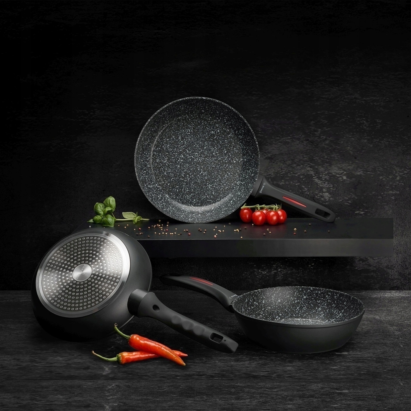 - powłoka typu non stick utwardzana drobinkami granitu o lekko szorstkiej teksturze, doskonałej odporności na ścieranie i zarysowania