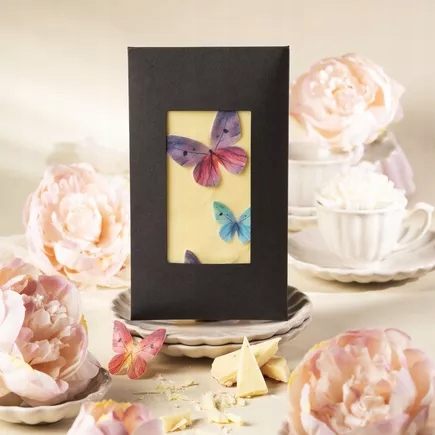 czekolada biała (cukier, tłuszcz kakaowy, MLEKO pełne w proszku, emulgator: lecytyny (SOJA), naturalny aromat waniliowy) (98,5%), miód wielokwiatowy (1%), motyle waflowe (0,5%) (wafel (skrobia ziemniaczana, olej roślinny, woda), barwniki: E151, E110, E133, E122, E102). E102, E110, E122 mogą mieć szkodliwy wpływ na aktywność i skupienie uwagi u dzieci. Może zawierać: ORZECHY, ORZESZKI ARACHIDOWE, JAJA, zboża zawierające GLUTEN, SEZAM. Kraj pochodzenia głównego składnika: Belgia.