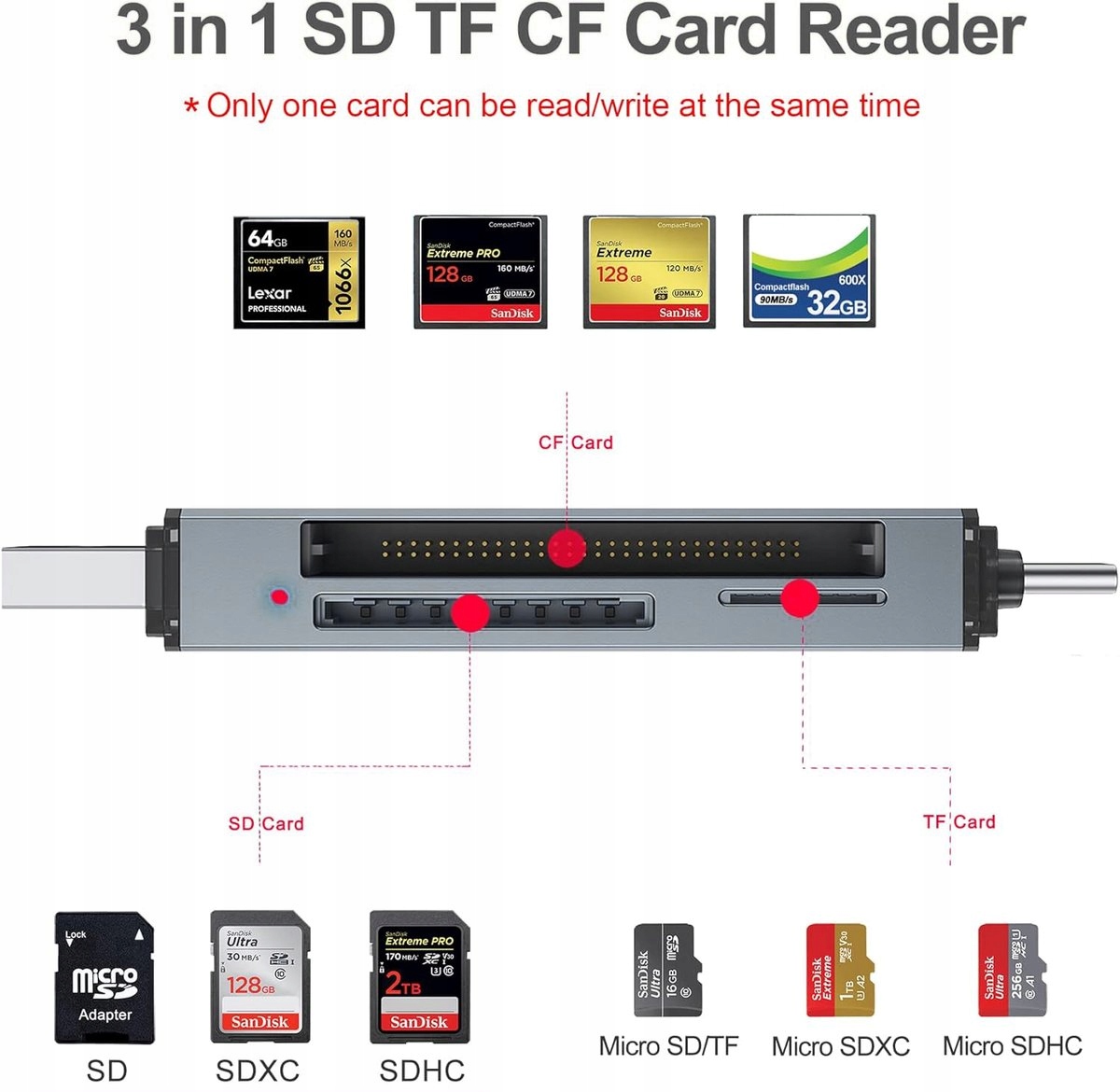 Czytnik kart SD TF/Micro SD CF 3 w 1 znacznie ułatwia udostępnianie zdjęć i filmów rodzinie lub znajomym w dowolnym miejscu i czasie.