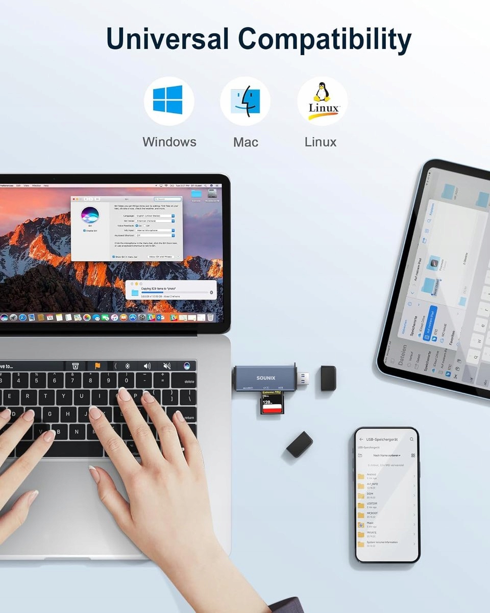 Czytnik wielu kart pamięci z interfejsami USB-A i typu c, kompatybilny z większością produktów dostępnych na rynku. Kompatybilny z Galaxy S23/S22/S21/S20/S10/Note 20/Note 10, MacBook Pro 2021/2020/2019/2018/2017/2016, MacBook Air 2021/2020/2019/2018, Surface Pro 9/8/7 /6/5/4/3/X, Surface Laptop 5/4/3 i więcej innych urządzeń.