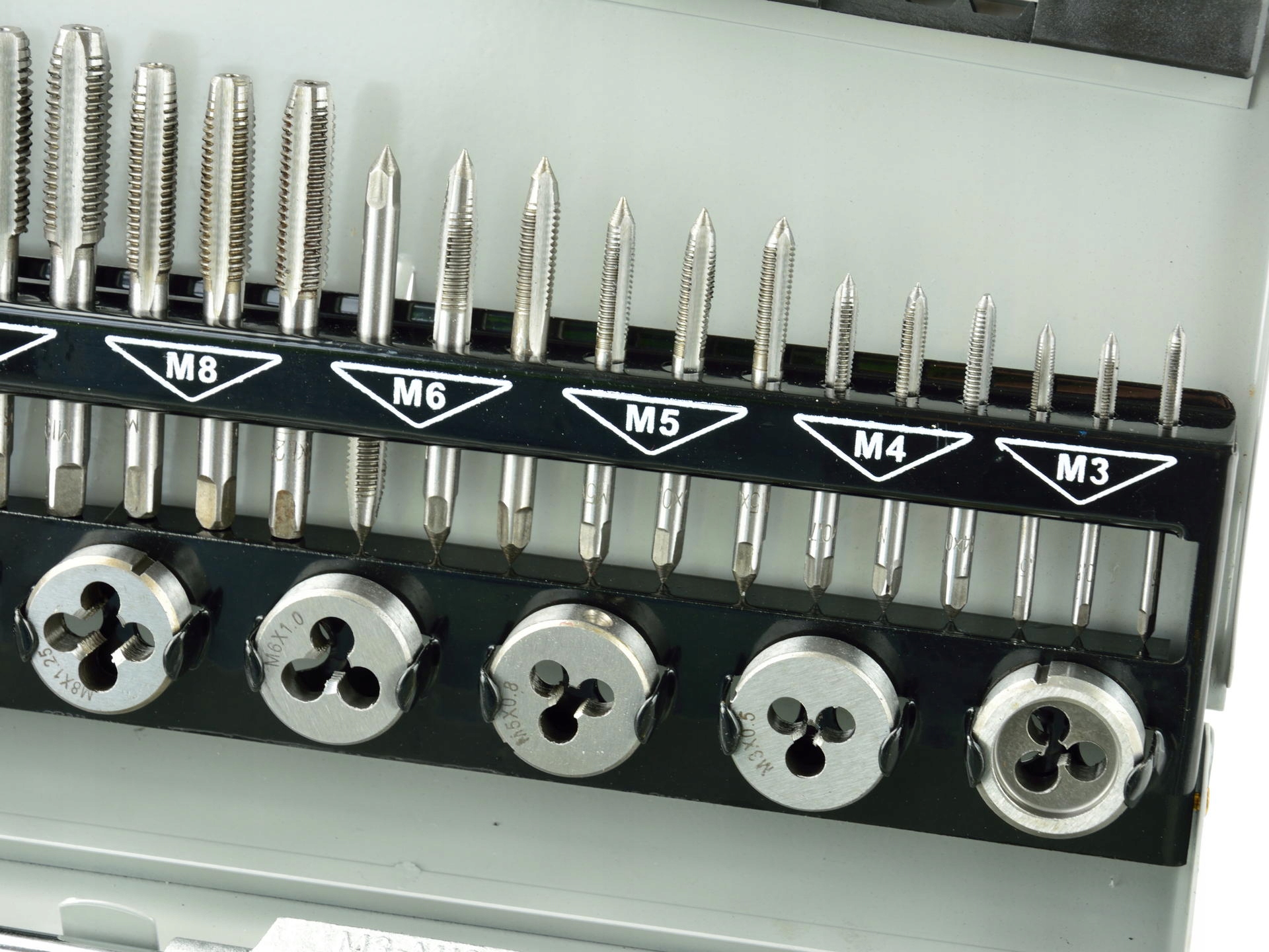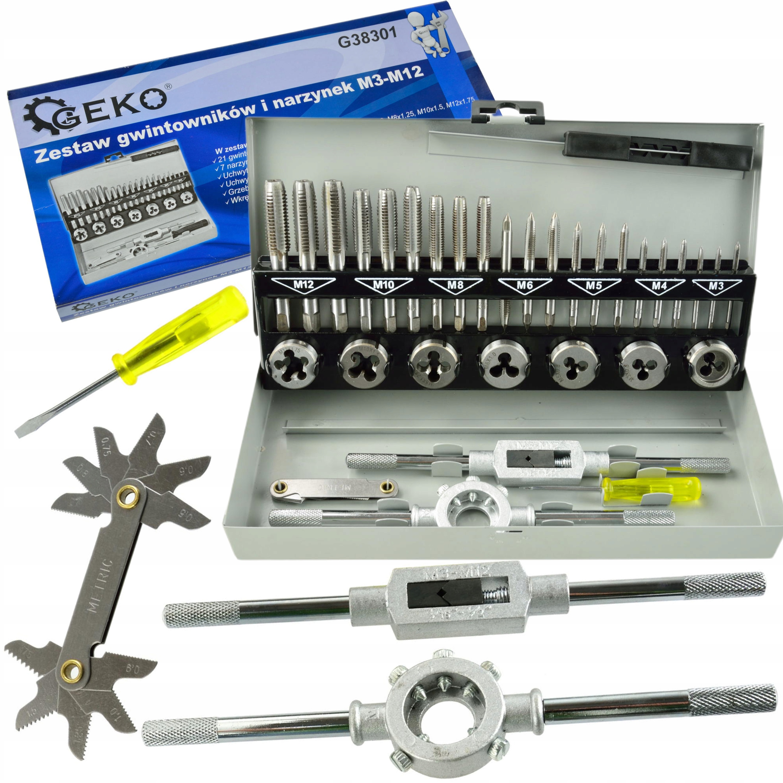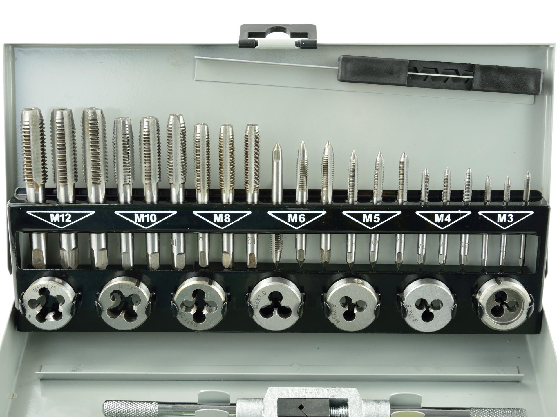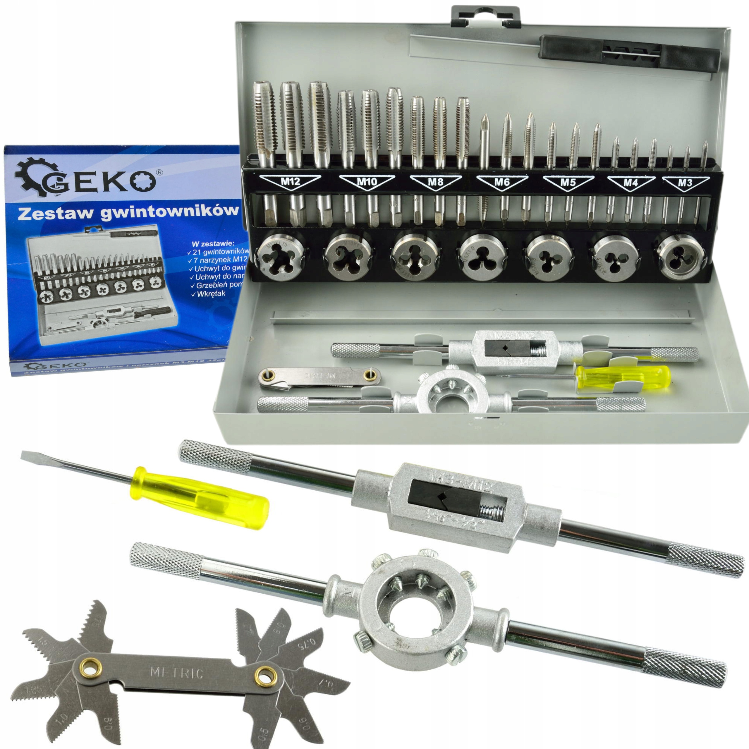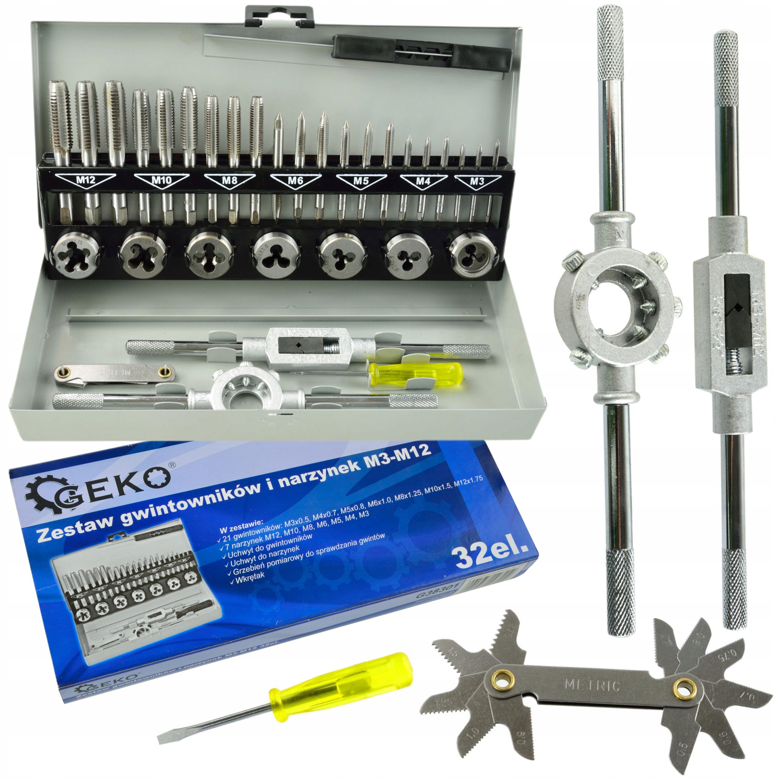 Nowoczesny zestaw gwintowników i narzynek M3 - M12. W skład zestawu wchodzą 32 różne narzędzia wykonanych z wysokogatunkowej stali.