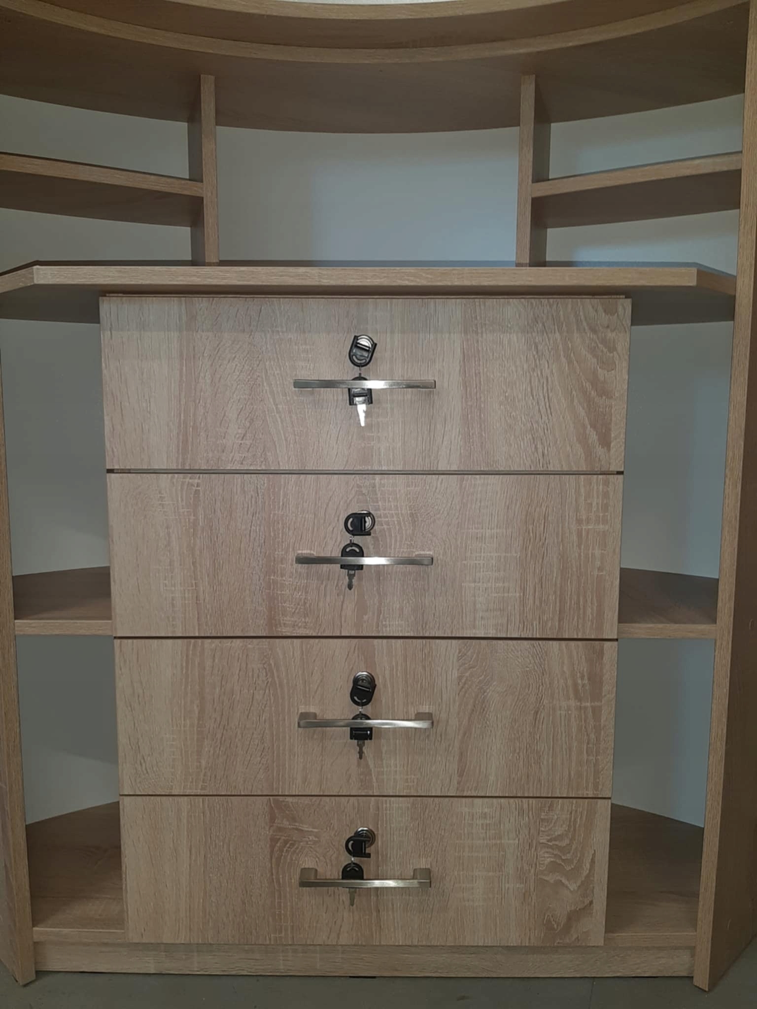 Mebel wykonany w Polsce z wysokiej jakości płyt meblowych Egger. Front lady, boki i blat w wysokim połysku (płyta meblowa Perfectsense Gloss - wysoki połysk), półki wewnętrzne, szuflady wykonane z płyty meblowej koloru białego.
