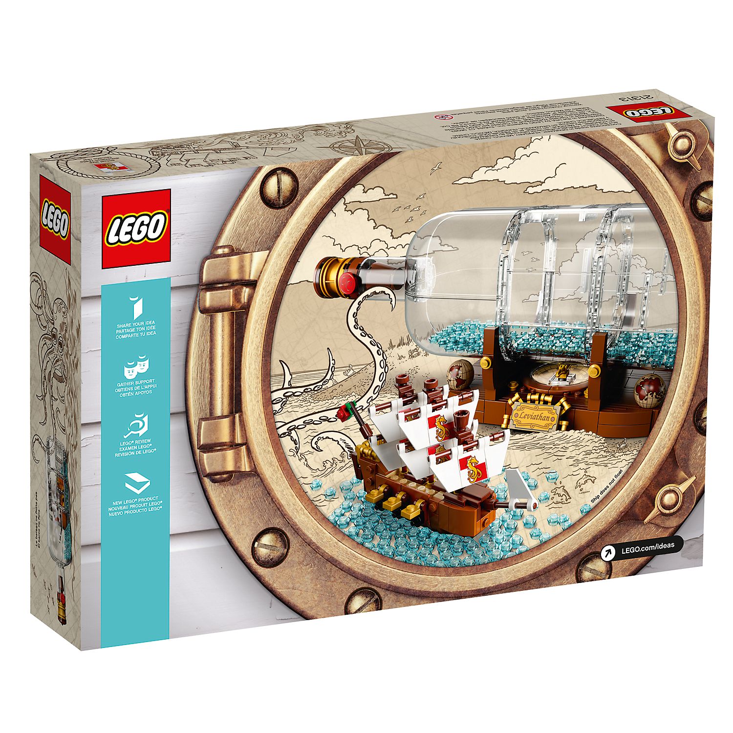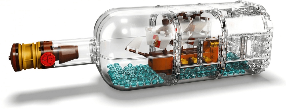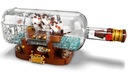 Zbuduj i pokaż światu LEGO® Pomysły Łódź w butelce. Zawiera składaną butelkę z korkiem, szczegółową łódź i płytę główną z tabliczką znamionową oraz kompas z obrotową igłą.