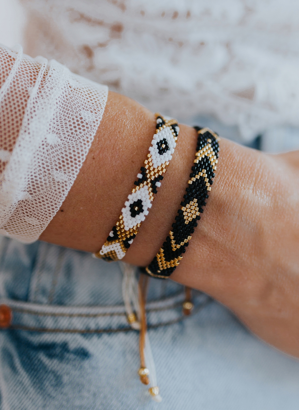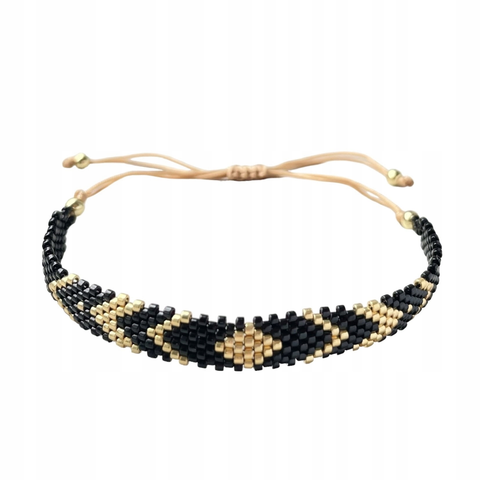 Bransoletka elegancka boho handmade czarna złota z koralików Miyuki regulowana na sznureczku