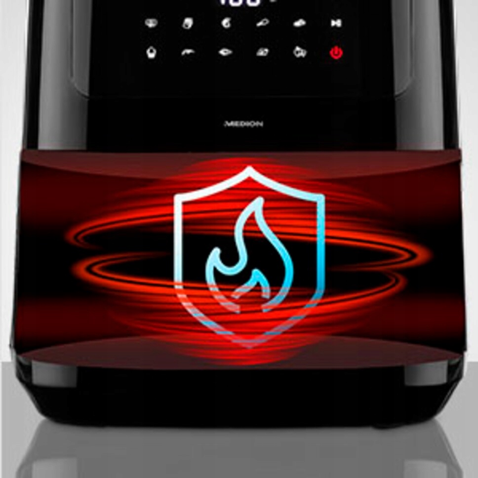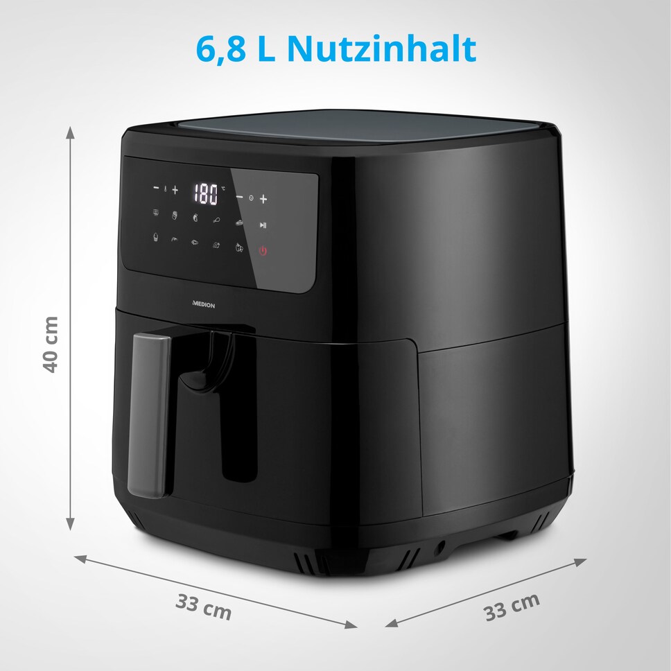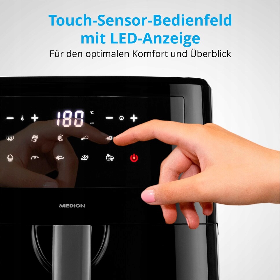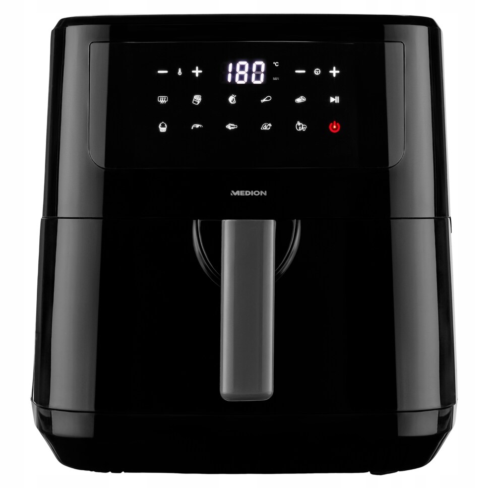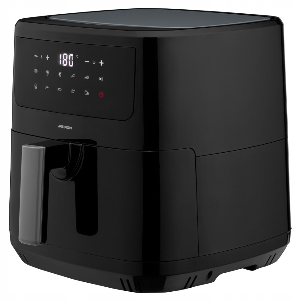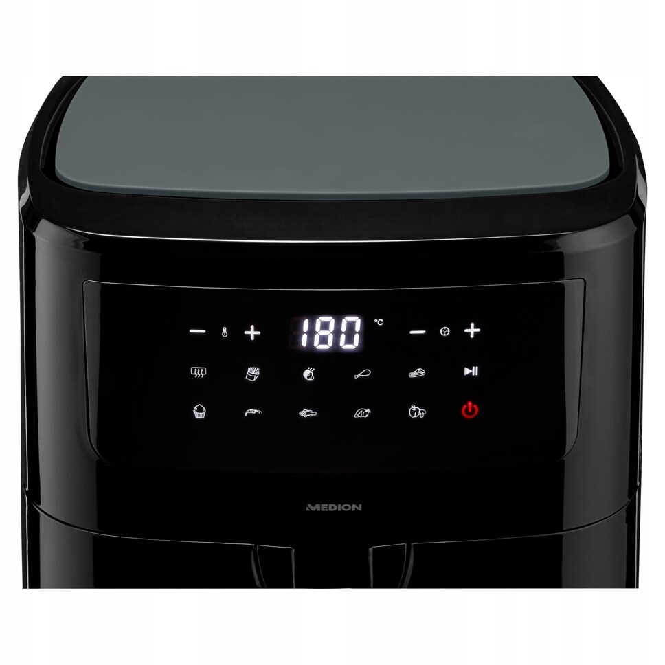 Dzięki nowej frytkownicy na gorące powietrze MEDION z dwoma mocnymi elementami grzejnymi ze stali nierdzewnej możesz cieszyć się bez żalu. Dzięki mocy 2150 watów urządzenie to osiąga maksymalne wyniki. Górny element grzejny o imponującej mocy 1800 W i dolny o mocy 350 W współpracują w idealnej harmonii, zapewniając doskonałą chrupkość i smak na talerzu. Twoja kulinarna kreatywność nie zna granic. W aplikacji MEDION Life+ znajdziesz teraz 100 darmowych przepisów na frytownicę na gorące powietrze . Imponująca pojemność użytkowa wynosząca 6,8 litra zapewnia miejsce dla całej rodziny. Twoja kulinarna podróż będzie dziecinnie prosta dzięki 9 zaprogramowanym ustawieniom. Regulacja temperatury od 50°C do 200°C, cyfrowy timer 60-minutowy i automatyczne wyłączanie gwarantują precyzyjne gotowanie i doskonałe rezultaty.