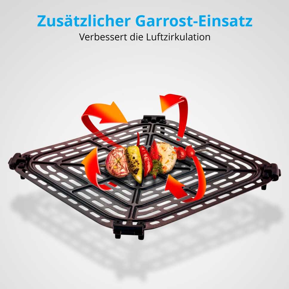 Dzięki dodatkowemu stojakowi do gotowania możesz dosłownie przenieść swoje jedzenie na nowy poziom! Dzięki podwyższonej pozycji Twoje frytki, ryby i mięso nie będą już pływać w niepotrzebnej ilości oleju. Poprawia również cyrkulację powietrza, zapewniając szczególnie chrupiącą skórkę.