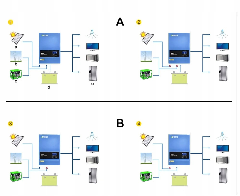 W innej konfiguracji może cały czas działać pobierając prąd z sieci, a kiedy ta przestanie podawać 230V przełączy na zasilanie z podłączonych paneli i/lub akumulatorów podtrzymując zasilanie odbiorników. Kiedy przywrócone zostanie zalanie z sieci ładowarka (wbudowany prostownik) doładuje akumulatory.