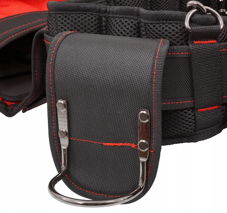 Pas narzędziowy z trzema przesuwanymi sakwami z licznymi kieszeniami oraz pentlą na młotek. Mocny ergonomiczny pas zapinany na metalową klamre. Posiada uchwyty do montażu szelek oraz regulowane szelki w zestawie. Materiał poliester 1680D . Tkaniny o splotach 1680D należą do grupy najbardziej wytrzymałych i trwałych materiałów. Gęsta gramatura zapewnia wyrobom wyjątkową wytrzymałość oraz odporność na różnego rodzaju uszkodzenia mechaniczne. Tkaniny charakteryzują się wyraźną strukturą splotu oraz posiadają dodatkowe powleczenie z PU. Taki sposób impregnowania wzmacnia materiał i nadaje tkaninie właściwości bryzgoszczelne. Do transportu i przechowywania narzędzi na stanowisku pracy.