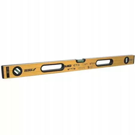 Poziomica MD5060 wykonana jest z profilu aluminiowego o grubości ścianki 1,5 mm. Dodatkowe przetłoczenia na profilu zapewniają większą wytrzymałość i odporność na uszkodzenia. W korpusie poziomnicy umieszczone są 3 libelki wskazujące pion, poziom oraz kąt 45°.