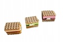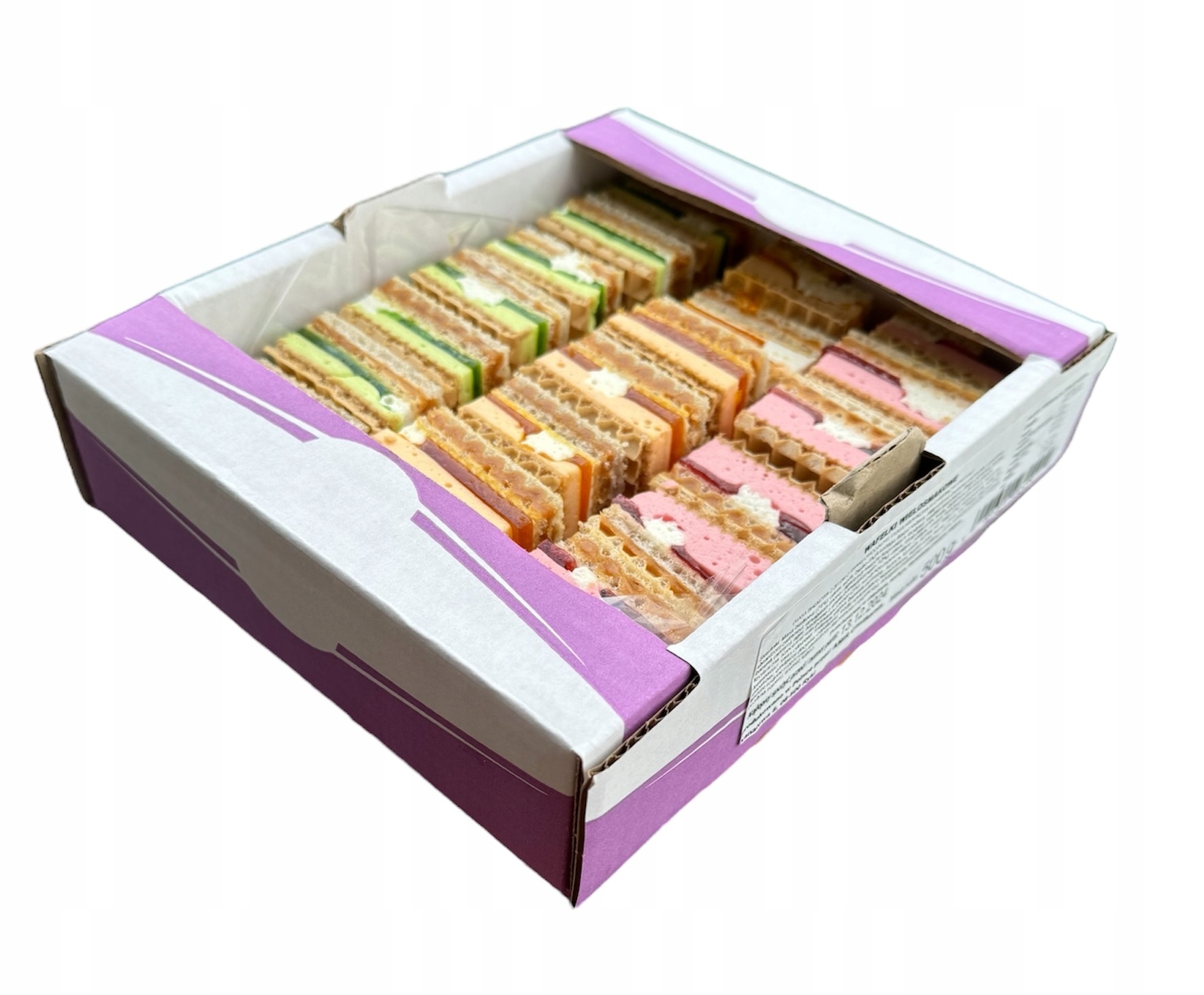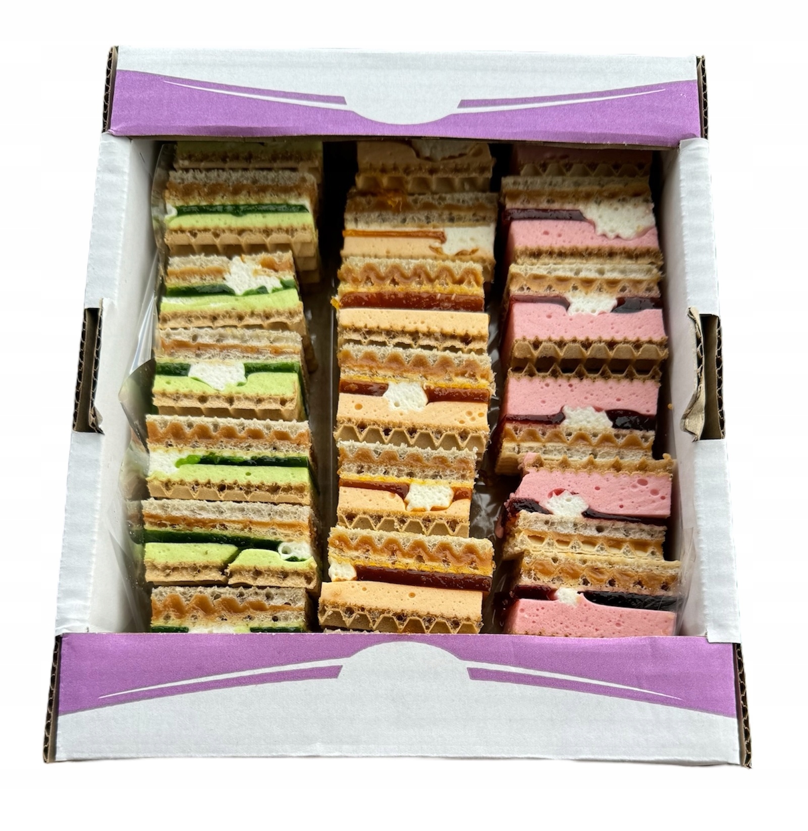 Chrupiące wafelki przekładane masą białkową z żelem o smaku owocowym, masą krówkową oraz galaretką.