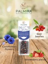 Oryginalna mieszanka herbat na bazie czarnej herbaty cejlońskiej i zielonej herbaty chińskiej z plastrami truskawek, jagodami Goji, jasnoniebieskimi płatkami bławatka.