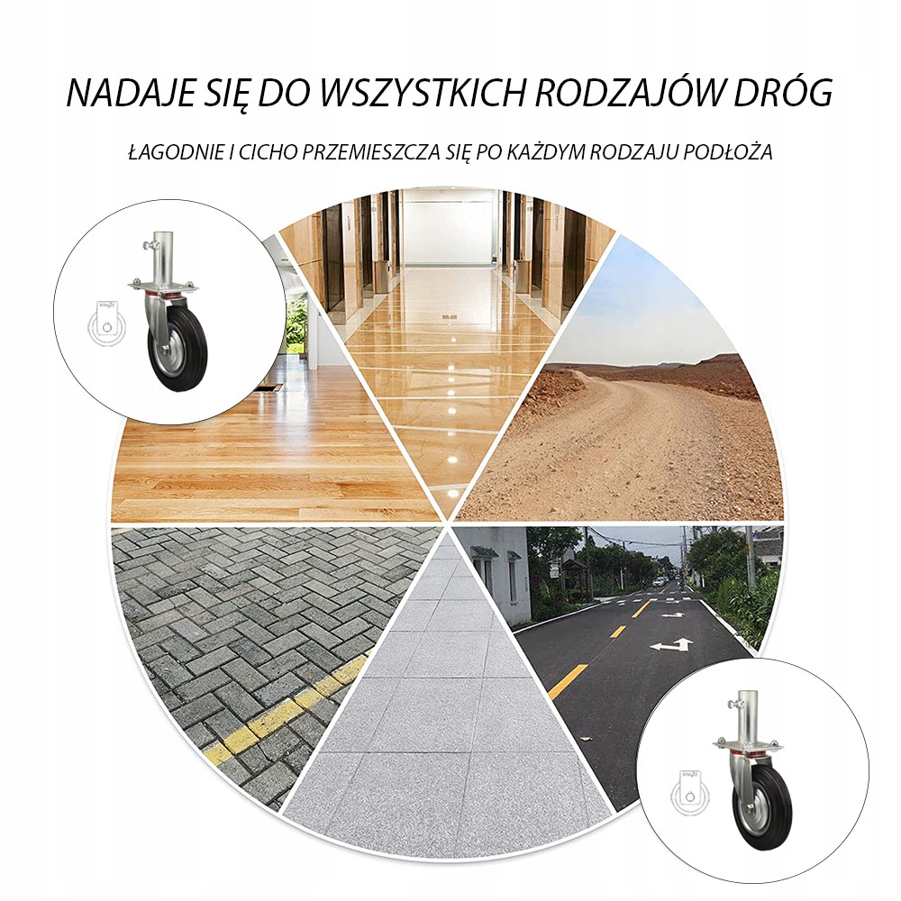 Koło posiada piastę metalową oraz oponę gumową, obudowa pokryta jest ocynkiem.